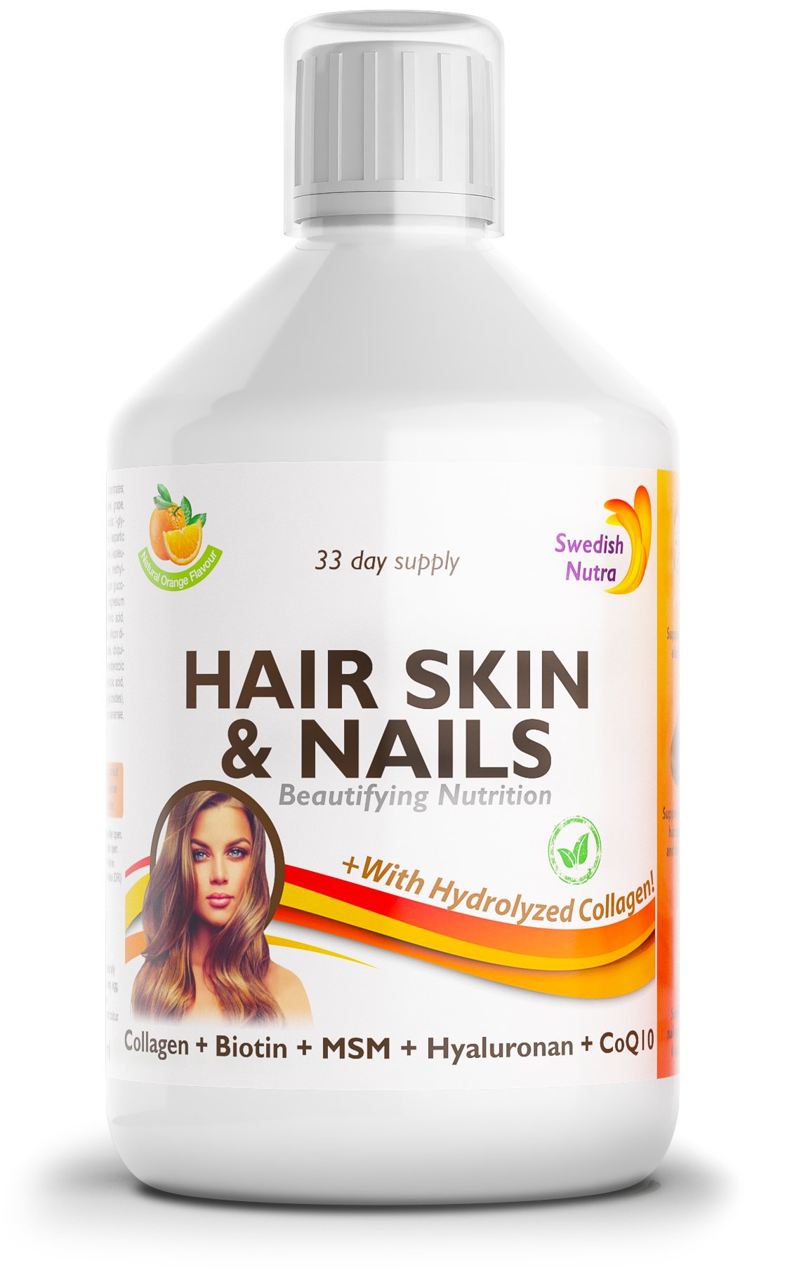 SWEDISH NUTRA HAIR, SKIN NAILS – LIQUID BEAUTY SUPPLEMENT (500 ML) Swedish Nutra Hair, Skin Nails is a complete, liquid beauty supplement with orange flavor, specially developed to support hair, skin and nails from within. The formula combines hydrolyzed collagen (type I III), biotin, MSM, hyaluronic acid, CoQ10, vitamins and minerals in one daily dose of 15 ml. With more than 25 active ingredients – including collagen, biotin (vitamin B7), vitamin C, vitamin A, zinc, copper and antioxidants from plant extracts – this supplement provides broad nutritional support for radiant skin, shiny hair and strong nails. The liquid form ensures rapid absorption and is ideal for daily use. KEY BENEFITS Support for hair, skin nails: Biotin, zinc and vitamin A contribute to the maintenance of normal hair, normal skin and normal nails. 1,000 mg collagen per 15 ml: Hydrolyzed collagen types I III in an easily absorbable, liquid form. Rich in vitamins minerals: Contains vitamin C, D3, E, B complex, zinc, copper, calcium and magnesium. With MSM, hyaluronic acid CoQ10: Well-known beauty nutrients that are often used in skin, hair and nail supplements. Liquid, tasty formula: Orange flavor, easy to take daily – straight or mixed with water or juice. USE Recommended dosage: 15 ml per day, preferably in the morning. Can be taken directly or mixed with water or juice. Shake the bottle well before use. STORAGE IMPORTANT INFORMATION 500 ml – sufficient for approx. 33 days at 15 ml per day. Store in the refrigerator after opening and consume within 2 months. Store cool, dry and out of direct sunlight. Keep out of reach of children. Food supplements are not a substitute for a varied, balanced diet and a healthy lifestyle. Consult your doctor or therapist first if you are pregnant, breastfeeding or taking medication. Swedish Nutra Hair, Skin Nails – daily beauty support from within.Easy to fit into the daily routine – 500 ml bottle, sufficient for approx. 33 days at 15 ml per day easy to take, directly or mixed with water or juice. Rich in antioxidants plant extracts – contains green tea, grape seed extract, horsetail, aloe vera and other nutrients commonly used in beauty and wellness supplements. 1,000 mg collagen per daily dose - per 15 ml serving 1,000 mg bovine collagen types I III, in an easily absorbable, liquid form with orange flavor. Supports hair, skin nails – biotin, zinc and vitamin A contribute to the maintenance of normal hair, skin and nails vitamin C supports normal collagen formation. Complete liquid beauty supplement – combination of hydrolyzed collagen types I III, biotin, MSM, hyaluronic acid, CoQ10, vitamins and minerals for hair, skin and nails.Swedish Nutra Hair, Skin Nails Voor de gezondheid en schoonheid van haar, huid, teint en nagels. Unieke formule met 26 actieve ingrediënten: Gehydrolyseerd vloeibaar collageen. SWEDISH NUTRA HAIR, SKIN NAILS – VLOEIBAAR BEAUTY SUPPLEMENT (500 ML) Swedish Nutra Hair, Skin Nails is een compleet, vloeibaar beautysupplement met sinaasappelsmaak, speciaal ontwikkeld om haar, huid en nagels van binnenuit te ondersteunen. De formule combineert gehydrolyseerd collageen (type I III), biotine, MSM, hyaluronzuur, CoQ10, vitamines en mineralen in één dagelijkse dosis van 15 ml. Met meer dan 25 actieve ingrediënten – waaronder collageen, biotine (vitamine B7), vitamine C, vitamine A, zink, koper en antioxidanten uit plantenextracten – biedt dit supplement een brede voedingsondersteuning voor een stralende huid, glanzend haar en sterke nagels. De vloeibare vorm zorgt voor een snelle opname en is ideaal voor dagelijks gebruik. BELANGRIJKSTE VOORDELEN Ondersteuning van haar, huid nagels: Biotine, zink en vitamine A dragen bij aan het behoud van normaal haar, normale huid en normale nagels. 1.000 mg collageen per 15 ml: Gehydrolyseerd collageen type I III in een goed opneembare, vloeibare vorm. Rijk aan vitamines mineralen: Bevat o.a. vitamine C, D3, E, B-complex, zink, koper, calcium en magnesium. Met MSM, hyaluronzuur CoQ10: Bekende beautynutriënten die veel worden gebruikt in huid-, haar- en nagelsupplementen. Vloeibare, smakelijke formule: Sinaasappelsmaak, eenvoudig dagelijks in te nemen – rechtstreeks of gemengd met water of sap. GEBRUIK Aanbevolen dosering: 15 ml per dag, bij voorkeur in de ochtend. Kan direct worden ingenomen of gemengd met water of sap. Voor gebruik de fles goed schudden. BEWAREN BELANGRIJKE INFORMATIE 500 ml – voldoende voor ca. 33 dagen bij 15 ml per dag. Na openen in de koelkast bewaren en binnen 2 maanden consumeren. Koel, droog en uit direct zonlicht bewaren. Buiten bereik van kinderen houden. Voedingssupplementen zijn geen vervanging voor een gevarieerde, evenwichtige voeding en een gezonde levensstijl. Raadpleeg bij zwangerschap, borstvoeding of medicijngebruik eerst uw arts of therapeut. Swedish Nutra Hair, Skin Nails – dagelijkse beauty-ondersteuning van binnenuit.Makkelijk in te passen in de dagelijkse routine – 500 ml fles, voldoende voor ca. 33 dagen bij 15 ml per dag eenvoudig in te nemen, direct of gemengd met water of sap. Rijk aan antioxidanten plantenextracten – bevat o.a. groene thee, druivenpitextract, paardenstaart, aloë vera en andere nutriënten die veel gebruikt worden in beauty- en wellnesssupplementen. 1.000 mg collageen per dagdosering – per 15 ml serving 1.000 mg rundercollageen type I III, in een goed opneembare, vloeibare vorm met sinaasappelsmaak. Ondersteunt haar, huid nagels – biotine, zink en vitamine A dragen bij aan het behoud van normaal haar, een normale huid en normale nagels vitamine C ondersteunt de normale collageenvorming. Compleet vloeibaar beautysupplement – combinatie van gehydrolyseerd collageen type I III, biotine, MSM, hyaluronzuur, CoQ10, vitaminen en mineralen voor haar, huid en nagels.