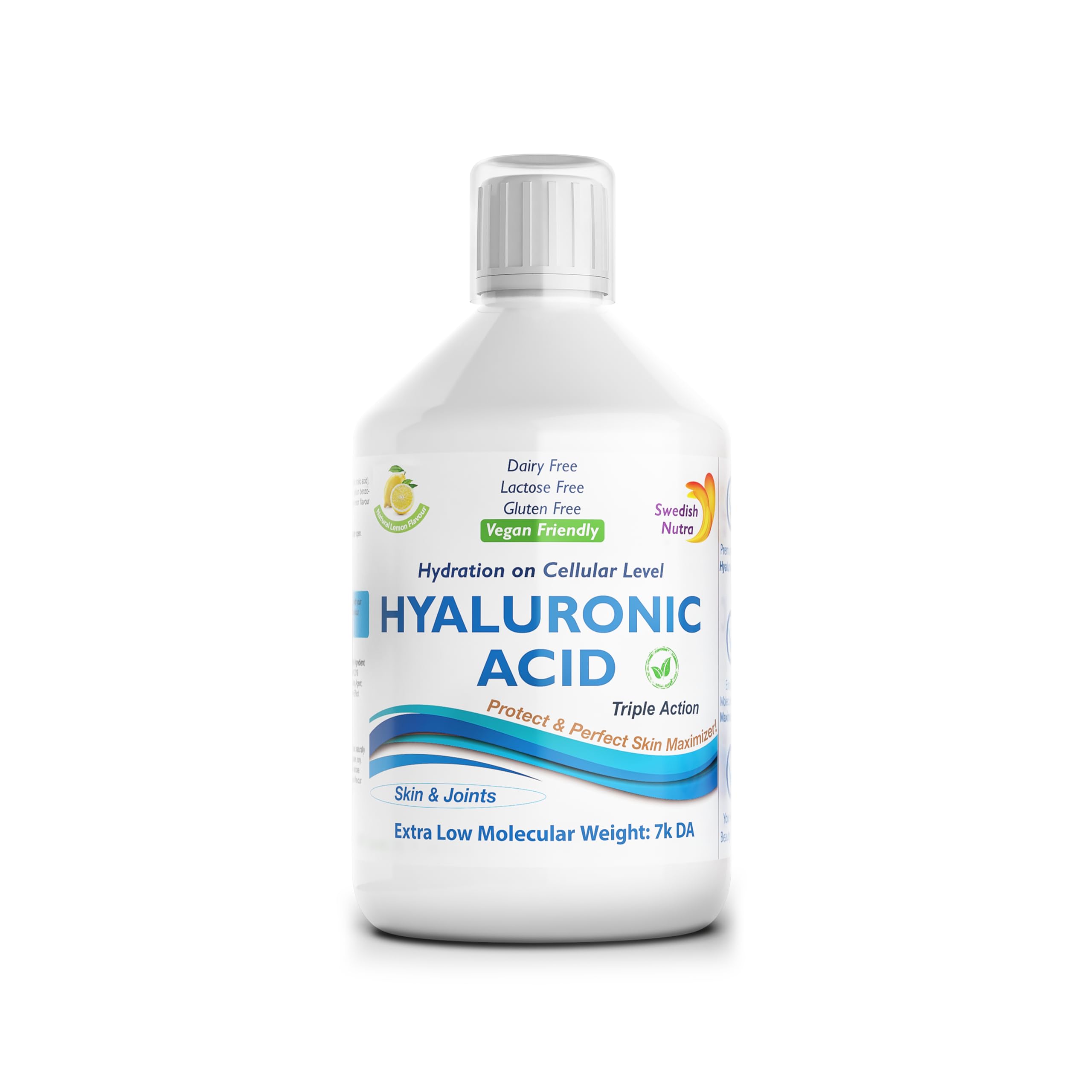 Swedish Nutra Hyaluronic Acid Liquid Supplement Pack of 500 ml 33 days supply Plus vitamin C & silica for hydration of the skin and joints Vegan and free from sugar and gluten