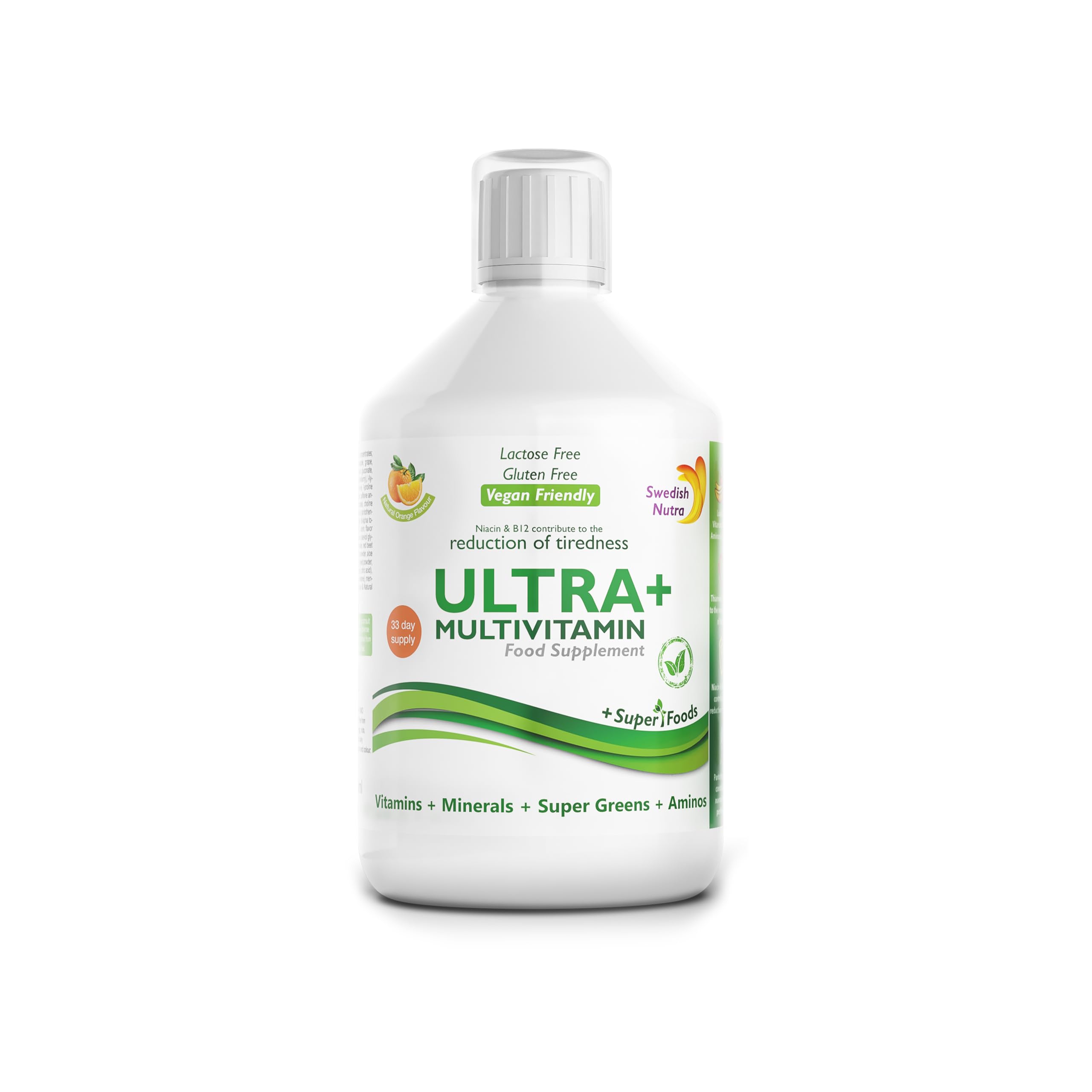 SWEDISH NUTRA ULTRA MULTIVITAMIN (500 ML) – COMPLETE LIQUID MULTIVITAMINE Swedish Nutra Ultra Multivitamin is a high-quality, liquid multivitamin formula that provides essential vitamins, minerals and micronutrients – designed to be used daily to supplement a healthy and balanced diet. The liquid form ensures quick absorption and is ideal for those who value convenience and effectiveness. This comprehensive blend supports general vitality, energy production, immune function, metabolism and overall health. One dose covers a broad spectrum of micronutrients, making Ultra Multivitamin a practical solution for busy lifestyles. KEY BENEFITS Complete micronutrient blend: vitamins, minerals and micronutrients in one daily dose. Liquid easily absorbed: no capsules or pills – easy to take and quickly absorbed by the body. Energy Vitality Support: Supports metabolism, immune system and daily performance. Daily wellness: ideal as a daily supplement to nutrition for general well-being and balance. Handy bottle (500 ml): sufficient supply for a longer period - easy to carry and dose. USE Take the recommended dosage daily as stated on the label. Can be drunk directly or mixed with water or juice. Shake well before use. Do not exceed recommended daily allowance. STORAGE IMPORTANT INFORMATION Store in a cool, dry place, out of direct sunlight. Close tightly after opening and store according to label instructions. Keep out of reach of children. Dietary supplement — not a substitute for a varied and balanced diet. Swedish Nutra Ultra Multivitamin – daily, complete support for vitality, energy and health. INGREDIENTS Multi Filtered water, natural fruit juice mixture of concentrates orange, apple, mandarin, guava, papaya, lime, mango, pineapple, grape, organic fruit and beet sugars, vitamin C, magnesium, potassium, calcium, choline, vitamin E, zinc, ginseng (panax ca meyer), caffeine, pantothenic acid, thiamin, riboflavin, niacin, inositol, 7 2 trace mineral as (marine, vegan), vitamin B6, vegetable amino acids: (l - glycine, l-proline, l-alanine, l-glutamine, l-arginine, l-lysine, l-leucine, l-valine, l-isoleucine, l-taurine), manganese, lutein, paba: 4-aminobenzoic acid, coenzyme Q10, chromium, freshness preserver (potassium sorbate), sodium benzoate), zeaxanthin, natural flavor: (natural orange), citrus bioflavonoids, psyllium extract, alfalfa extract, broccoli extract, spirulina, ashwagandha, aloe vera extract, green tea extract, green coffee bean extract, grape seed extract, lycopene extract, lecithin extract, sweetener (steviol glycosides), acidity regulator (citric acid), vitamin D (vegan, from lichen), vitamin B1 2, folic acid, biotin, iodine, selenium, molybdenum, vitamin K, vitamin A. 100 natural flavors and colors. INSTRUCTIONS FOR USE Take a 15 ml shot daily. SAFETY WARNING If you suffer from an illness or are pregnant or breastfeeding, consult your doctor before use. Discontinue use in case of side effects. Food supplements should not replace a varied diet. See more? ABOUT SWEDISH NUTRA: We produce in Sweden and specialize in natural liquid nutritional supplements. Liquid is absorbed by the body more efficiently than tablets or capsules and thus ensures optimal results. OUR ENVIRONMENT IS IMPORTANT TO US: We also take responsibility for our environment seriously. The earth needs care and here at Swedish Nutra we are doing our part. We produce with the aim of leaving no footprint. Liquid Formula: Liquid formula instead of pills or powder. Our fluids are quickly absorbed into your system and our vitamins are soluble in water. ORANGE FLAVOR: Our delicious orange flavor is not only tasty, but also contains no artificial colors or flavors. We are proud that our vitamins are free from genetic manipulations and gluten and lactose. Ideal for adult men and women. ✓ BENEFITS OF MULTIVITAMINS: As we age, it becomes more difficult for the body to absorb nutrients and medications can also strip our body of nutrients. A multivitamin supplement can compensate for these deficiencies and have a positive effect on your heart and eyes and delay signs of regrowth.Vegan Multivitamin Vloeibaar Veganistisch SWEDISH NUTRA ULTRA MULTIVITAMIN (500 ML) – COMPLETE VLOEIBARE MULTIVITAMINE Swedish Nutra Ultra Multivitamin is een hoogwaardige, vloeibare multivitamineformule die voorziet in essentiële vitamines, mineralen en micronutriënten – ontworpen om dagelijks te gebruiken als aanvulling op een gezonde en evenwichtige voeding. De vloeibare vorm zorgen voor een snelle opname en ideaal voor wie gemak en effectiviteit waardeert. Deze uitgebreide mix ondersteunt algemene vitaliteit, energie-productie, immuunfunctie, stofwisseling en algehele gezondheid. Met één dosering dek je een breed spectrum aan micronutriënten, waardoor Ultra Multivitamin een praktische oplossing is voor drukke levensstijlen. BELANGRIJKSTE VOORDELEN Complete micronutriëntenmix: vitamines, mineralen en micronutriënten in één dagelijkse dosis. Vloeibaar goed opneembaar: geen capsules of pillen – eenvoudig in te nemen en snel door het lichaam opgenomen. Ondersteuning van energie vitaliteit: ondersteunt metabolisme, immuunsysteem en dagelijkse prestaties. Dagelijkse wellness: ideaal als dagelijkse aanvulling op voeding voor algemeen welzijn en balans. Handige fles (500 ml): voldoende voorraad voor langere periode – makkelijk mee te nemen en te doseren. GEBRUIK Neem dagelijks de aanbevolen dosering in zoals vermeld op het etiket. Kan direct worden gedronken of gemengd met water of sap. Voor gebruik goed schudden. Aanbevolen dagelijkse hoeveelheid niet overschrijden. BEWAREN BELANGRIJKE INFORMATIE Bewaren op een koele, droge plaats, uit direct zonlicht. Na openen goed afsluiten en volgens labelvoorschriften bewaren. Buiten bereik van kinderen houden. Voedingssupplement — geen vervanging voor een gevarieerde en evenwichtige voeding. Swedish Nutra Ultra Multivitamin – dagelijkse, complete ondersteuning voor vitaliteit, energie e