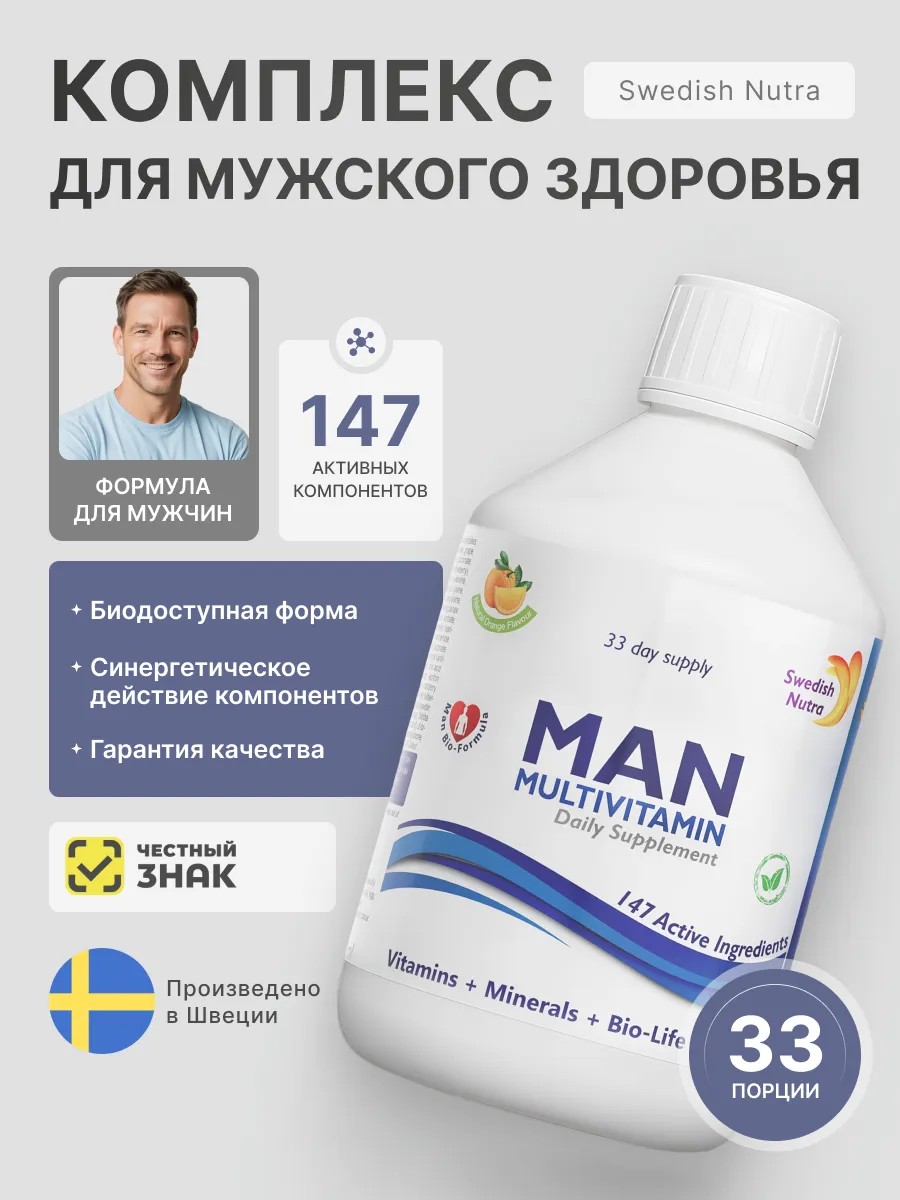 Man Multivitamin, a complex of key minerals, vitamins, amino acids, and plant extracts created specifically for men, improves mental and physical performance, supports prostate health, boosts immunity, reduces the negative effects of stress, and normalizes digestive function. This unique product provides men with essential and rapidly absorbed amino acids that promote muscle recovery and growth. The complex contains 147 active ingredients that work synergistically for maximum effect. The product is sugar-free and free of artificial additives, making it safe and healthy. Each package contains 33 servings, providing more than a month's supply of nutrients. Directions: Take 15 ml with meals daily. This multivitamin complex is designed for men who lead an active lifestyle and strive to maintain high levels of health. Man Multivitamin helps strengthen the immune system, improve brain function, and enhance physical endurance, which is especially important under increased stress. Regular use of this complex promotes normal digestion, supports prostate health, and helps the body cope with the negative effects of stress. The amino acids in this complex promote effective muscle recovery after exercise, supporting muscle growth and strengthening. The vitamins and minerals in Man Multivitamin provide the body with all the necessary micronutrients to maintain health and vitality. This product is ideal for men who strive to take care of their health and maintain a high level of physical and mental activity. Man Multivitamin from Swedish Nutra is a reliable assistant in maintaining your health and well-being every day.