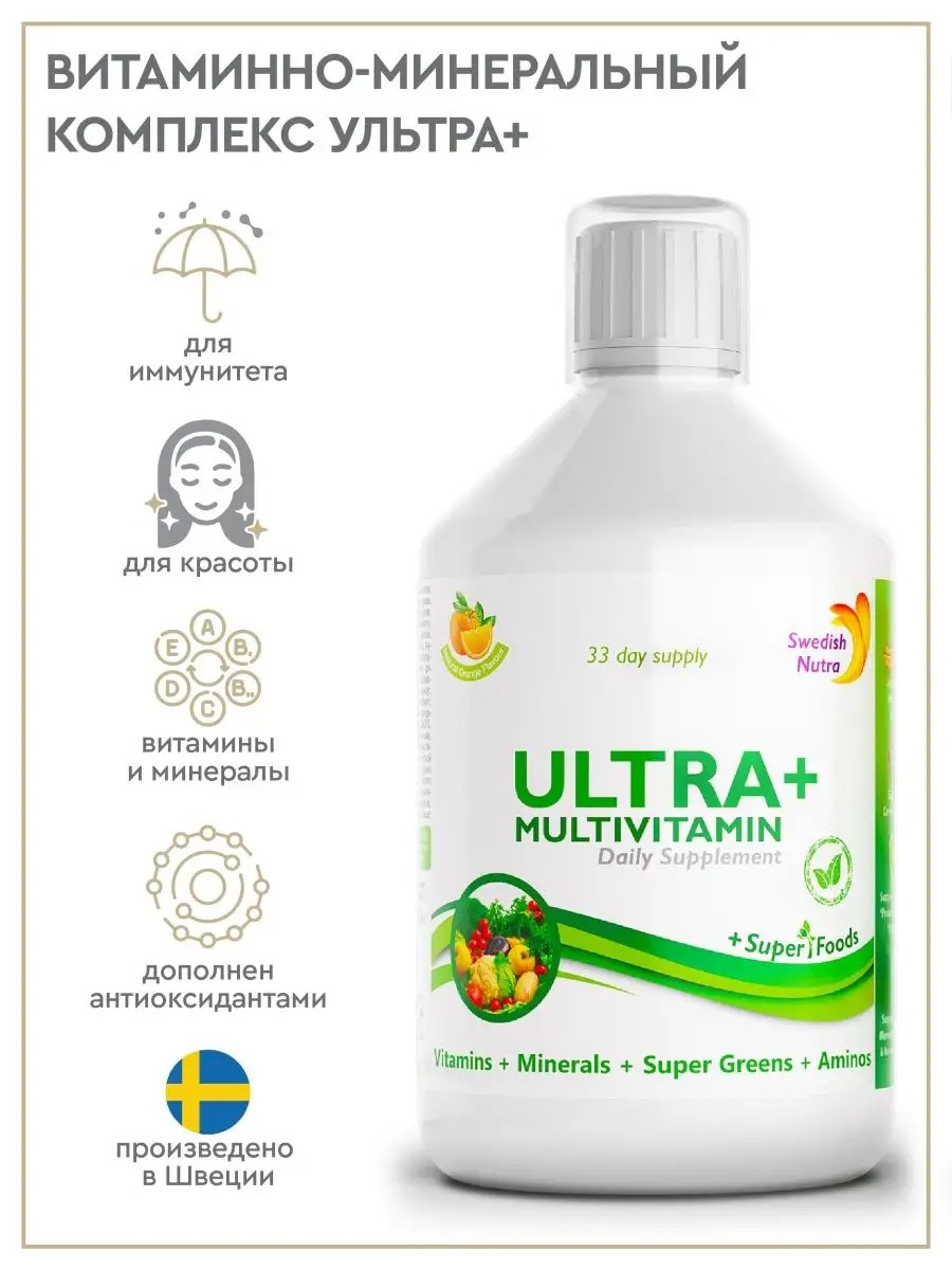 ULTRA+ MULTIVITAMIN - это питьевая форма комплексной комбинации жизненно важных витаминов, минералов, растительных экстрактов и важных аминокислот, которые поддерживают здоровье человека. Эта добавка произведена шведской фармацевтической компанией и является одним из лучших продуктов на рынке витаминных комплексов.
