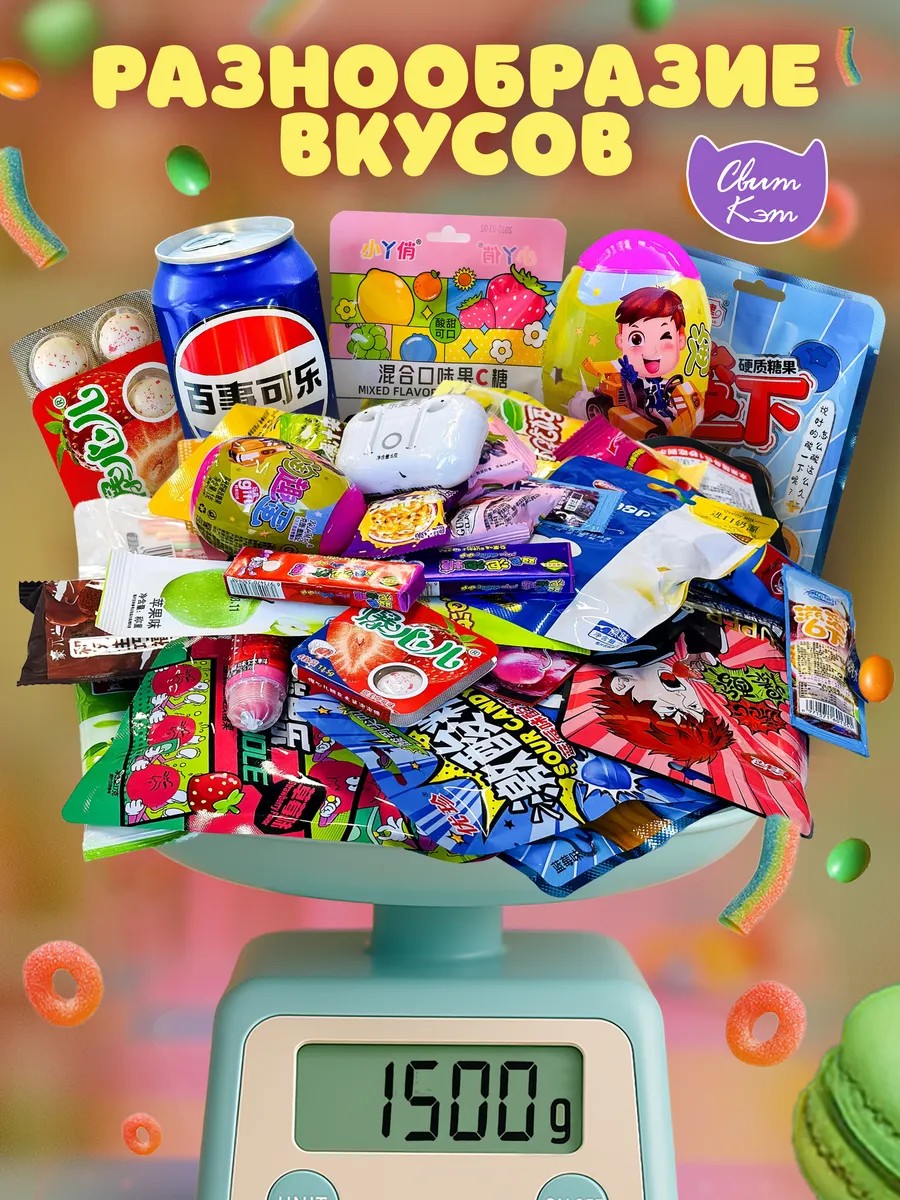 The Sweet Cat candy gift set is a true surprise, combining unusual Chinese candies, Korean delicacies, and assorted chocolates for every taste, all weighing 1500g. This candy box will delight everyone: it includes sour candies, refreshing lollipops, sugar-free coffee candies, chewy candies, mini candies, and small candies for children. This candy gift set is an excellent choice for a gift for a man, a gift for a girl, a gift for a boy, or a gift for a girl—everyone loves sweets. Chinese and Korean sweets have long been popular products worldwide, and this Chinese candy set opens the door to a world of unusual flavors that will surprise both adults and children. This candy box is perfect as a gift for children, as the children's candies in the set are safe and delicious, and the fizzy drinks and chewy candies will bring a bright emotion. If you're looking for gifts for children or want to find cute gifts for loved ones, the Sweet Cat candy box is the perfect solution. The sweets box is designed to offer something for everyone: from mini Chinese food to Korean candies, from caramel candies to healthy sugar-free sweets. The Sweet Cat gift set is versatile: it can be given as a gift for a holiday, as a surprise for friends, or as a gift set for children. This sweet set will create an atmosphere of joy and offer new taste experiences. This candy set and gift box will emphasize your care and attention, as sweets are always a popular gift. Chinese products in original packaging look stylish and modern, and the unusual sweets make this set truly unique. The Sweet Cat gift set is an excellent choice for those who value variety and quality, as it includes Chinese candies, Korean sweets, and healthy treats in a single box. Whether you want to surprise loved ones, delight children, or surprise a colleague, the Sweet Cat sweets gift set is the perfect solution, combining taste, joy, and versatility. These sweet sets aren't just products, but emotions that bring happiness.