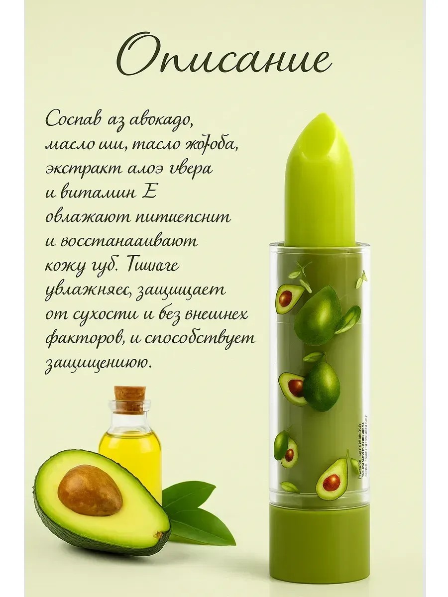 Подарите своим губам идеальный уход с натуральной губной помадой-бальзамом “Авокадовая Нежность” с маслом авокадо! Этот продукт разработан для тех, кто ценит натуральность, эффективность и комфорт. Он идеально подходит как для женщин, так и для мужчин, а также безопасен для детей. Универсальный помощник в любой сезон — от знойного лета до суровой зимы.