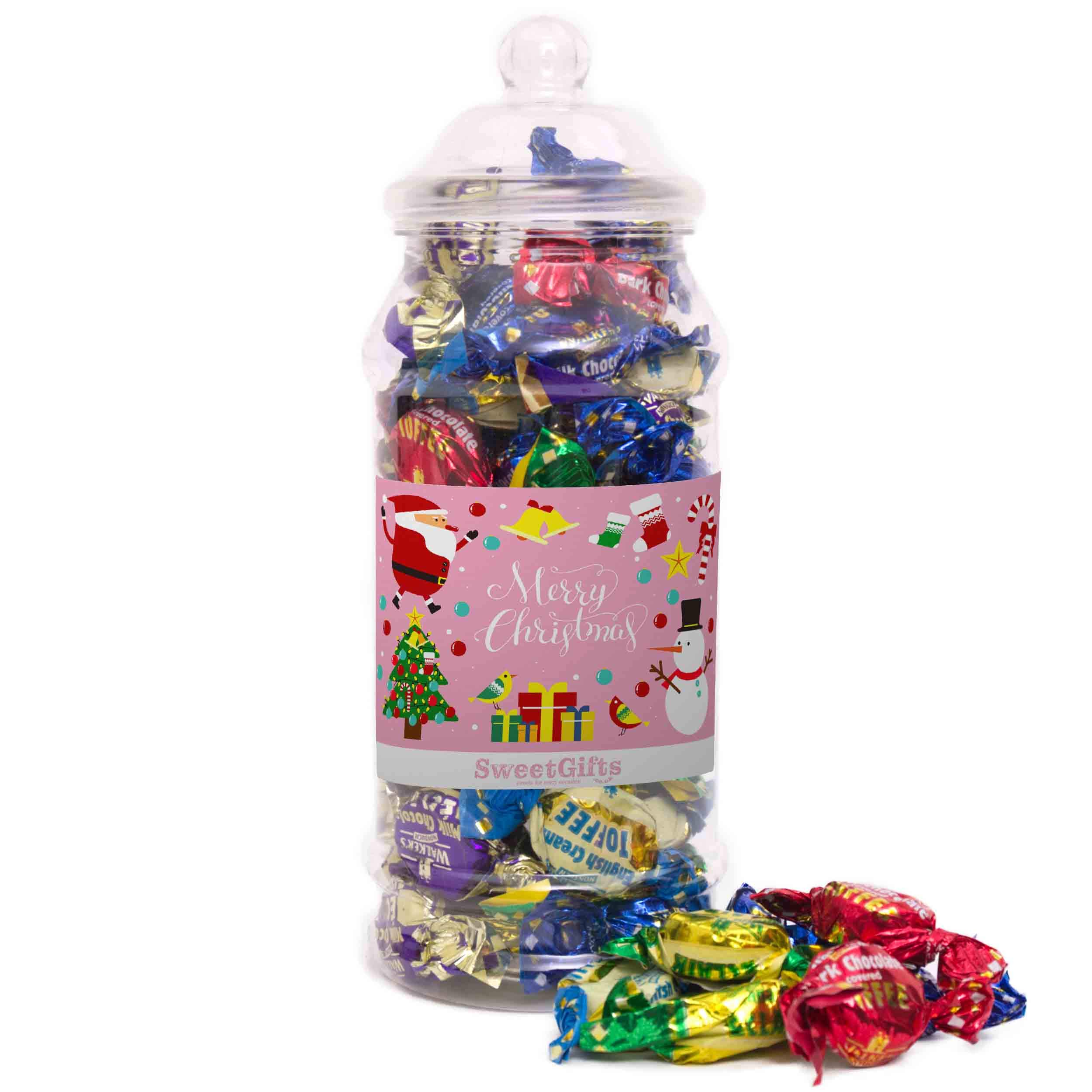Introducing our range of CHRISTMAS SWEETS JARS. These jars are packed full with retro-style Assorted Wrapped Toffees & Eclairs, perfect for your loved one, friends and family on Christmas day. With a festive Christmas themed label, these jars make a great Christmas gift that will be sure to create a sweet smile. The classically Victorian-styled plastic jar is resealable, with a screw top, and labelled with the 'Christmas Pink label', making these jars the perfect xmas present or stocking filler. We have various label choices available and have a huge sweets range so you will be sure to find something suitable for all ages, tastes and occaisons. INGREDIENTS Glucose syrup, sugar, sweetened condensed MILK 18%, vegetable oil, MILK chocolate ((cocoa solids 35%, milk solids 14%) sugar, cocoa mass 36%, whole MILK powder 15%, emulsifier:SOYA lecithin, natural vanilla), plain chocolate ((cocoa solids 70%min) cocoa mass, sugar, fat reduced cocoa powder, emulsifier:SOYA lecithin), white chocolate (sugar, whole MILK powder, cocoa butter, skimmed MILK powder, emulsifier:SOYA lecithin, natural vanilla), butter 3%, salt, molasses, emulsifier (E471), flavourings. MAY CONTAIN NUT TRACES. MANUFACTURER CONTACT INFORMATION Unit 14 Bennerley Court, Bulwell, Nottingham, NG6 8UT See moreTHE BRAND: With over 7 years of experience in confectionery products and with over 3 million products sold nationwide, you can be assured that we know exactly how to provide the perfect affordable sweet gift ideas. THE PACKAGING: Our jars are full resusable, recyclable and resealable. THE PERFECT GIFT IDEA: Sweets jars are great gift ideas, suitable for any occasion. Everyone enjoys a jar of sweets, so if you're struggling to find that perfect present, you cannot go wrong with one of our jars of sweets. The jars are also a good storage container for things like stationery, money, loose toys (the list is endless). THE SWEET RANGE: Sweet Gifts provide a range of over 50 different sweet types so there is always something for all tastes and ages. Why not browse through our retro favourites such as Flying Saucers, Fruit Salads, Black Jacks or the all-time favourites such as Fizzy Blue Bottles, White Chocolate Jazzies, Jelly Mix and you will be sure to find that perfect tasting gift. All our sweets are freshly stocked using only top quality suppliers and manufacturers. THE PRODUCT: Do you know some one who's so mad about sweets that they will not share a single piece? If so, this is the perfect jar of sweets for them. Our CHRISTMAS SWEETS JAR is the ideal affordable gift, lovingly hand packed with your choice of sweets, nicely presented in the Victorian-style jar and labelled with 'Christmas Pink label'.
