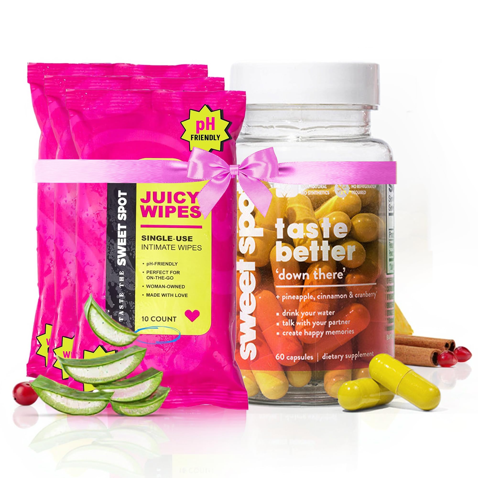 Sweet Spot Pineapple Extract Vaginal Probiotics Flushable Feminine Wipes Bundle Experience complete wellness and intimate care with our Sweet Spot Pineapple Extract Vaginal Probiotics and Flushable Feminine Wipes Bundle. Designed specifically for women, this bundle combines the power of probiotics with the convenience of pH-balanced, flushable wipes, offering you an all-in-one solution for vaginal health and hygiene. Our Pineapple Extract Vaginal Probiotics work to restore and maintain a healthy balance in your vaginal flora, supporting your body's natural defenses. These probiotics help reduce discomfort and promote overall vaginal wellness, whether you're dealing with occasional imbalances or looking to support long-term health. The flushable feminine wipes in this bundle are designed for daily use, offering an instant feeling of cleanliness and freshness wherever you go. Perfect for women who are always on the move, these wipes are pH balanced, paraben-free, and safe for sensitive skin. They are flushable, making them convenient, eco-friendly, and easy to carry in your purse or bag for quick freshness at home, at work, or on the go. Each bundle includes 60 capsules of Pineapple Extract Vaginal Probiotics and a 3-pack of 10-count feminine wipes, making it easy to enjoy long-lasting health benefits with every use. These natural, gentle ingredients work in harmony to support your vaginal health, boost your confidence, and help you feel comfortable throughout the day. With Pineapple Extract, this bundle not only supports vaginal health but also helps you feel fresher and more comfortable down there. You'll enjoy the added benefit of a better, more pleasant feeling, and taste better naturally. Whether you're looking for a natural way to maintain your vaginal health or need a convenient solution for daily hygiene, our Sweet Spot Pineapple Extract Vaginal Probiotics Flushable Feminine Wipes Bundle is the perfect choice. Make self-care a priority with this powNatural Effective Ingredients: Infused with Pineapple Extract, these probiotics and wipes deliver natural, effective support for vaginal health, ensuring comfort and confidence for women who want the best care for their intimate wellness. Travel-Friendly Convenient: The 3-pack of flushable feminine wipes are perfect for women on the go, offering a discreet and convenient way to stay fresh wherever you are—whether at home, work, or while traveling. Gentle Safe for Daily Use: Both the probiotics and wipes are formulated to be gentle on sensitive skin, with pH balance and paraben-free ingredients, providing a safe and soothing solution for intimate hygiene. Promotes Vaginal Health: The Pineapple Extract Vaginal Probiotics help restore and maintain a healthy vaginal flora, enhancing natural balance while the feminine wipes offer instant cleanliness and freshness throughout the day. Taste Better Down There Promote Vaginal Health: Our Pineapple Extract Vaginal Probiotics, along with Cranberry and Cinnamon, help restore and maintain healthy vaginal flora, fix odor, and enhance natural balance. These ingredients work together to help you taste better down there. The flushable feminine wipes offer instant cleanliness and freshness throughout the day.
