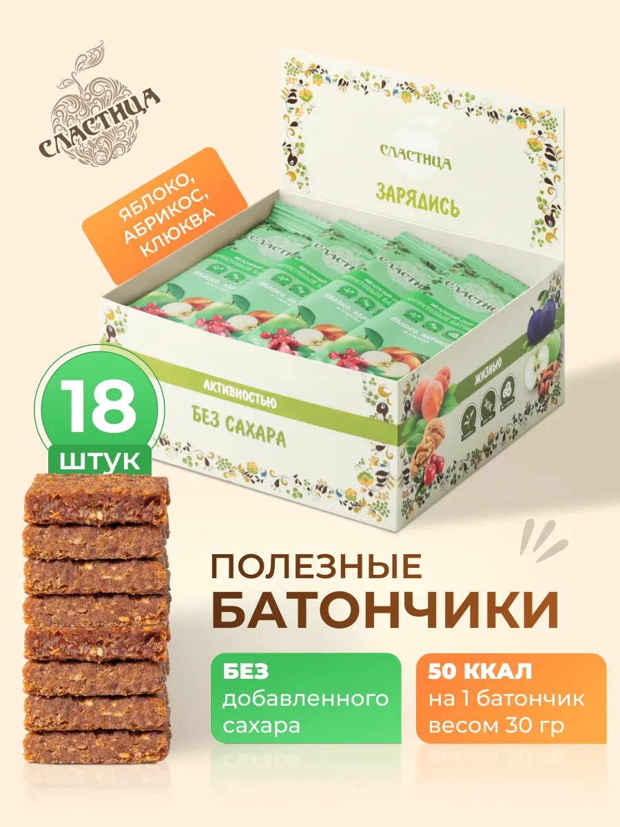 Батончики натуральные без добавления сахара с абрикосом и клюквой СЛАСТИЦА представляют собой идеальный выбор для тех, кто ведет активный образ жизни и заботится о своем здоровье. В упаковке 18 шт. Эти многокомпонентные пастила-батончики сочетают в себе сладость и легкую кислинку, обеспечивая богатый и насыщенный вкус без добавления сахара. Они обогащены сухофруктами и ягодами, что делает их отличным источником питательных веществ.