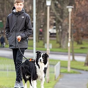 The Sweetie bungee dog lead is designed with a shock-absorbing section that stretches when the dog pulls or when you pull it back. This stretching gives you and the dog more gentle tugs during the walk.