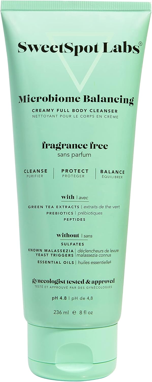 SweetSpot Labs Microbiome Balancing Full Body Cleanser cleanses helps protect skin prone to bacterial yeast imbalances. Made with clean ingredients without common Malassezia triggers, this pH-balanced wash leaves skin healthy balanced from chin to toe everywhere in between.