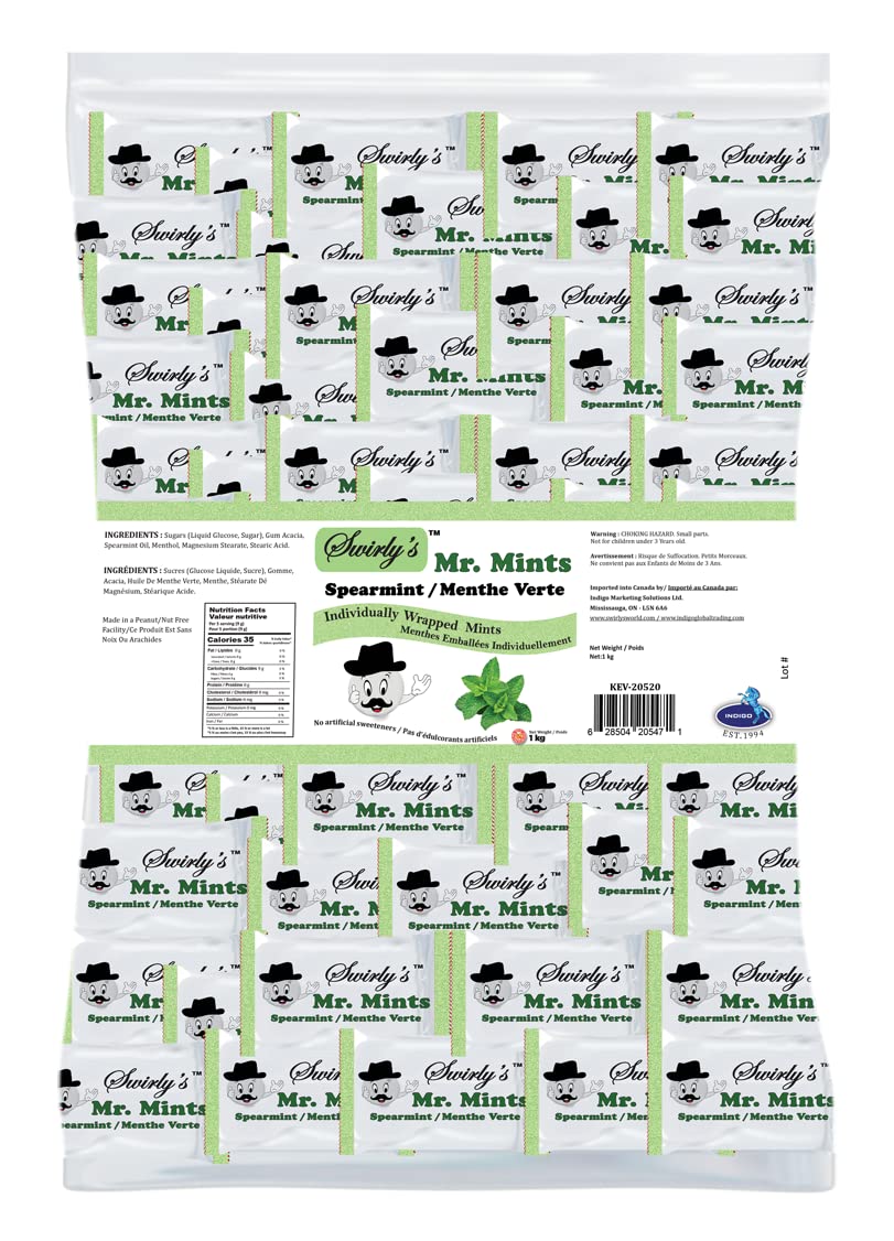 Revel in the freshness of Mr. Mints made with real spearmint oil, free of artificial colours and preservatives. Mr. Mints do not contain Aspartame and Gelatin. We hate all the bad stuff as much as you do! This Vegetarian candy is made with care in a nut-free facility. All candies in a bag are individually wrapped and are perfect for sharing with friends and family. Great value for money. You get about 550 individually wrapped Mints in a bag!You get about 550 individually wrapped Mints in a bag!. Made in a Nut-free Facility. Free from Artificial Colors and Preservatives. Gluten-Free Mints, Gelatin-Free Mints. Vegetarian Mints free from Artificial Sweeteners (Aspartame-Free). Made from Pure Spearmint Oil for that refreshing mouthfeel.