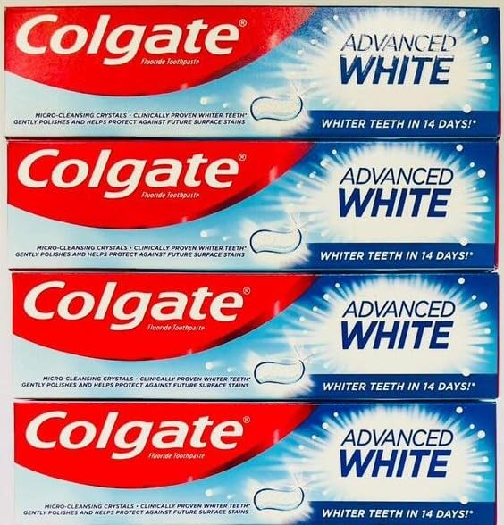 Achieve a visibly whiter, healthier-looking smile with Colgate Advanced White Fluoride Toothpaste 4 Pack Bundle (100ml x 4) - the perfect choice for those seeking effective whitening without compromising on their daily oral care. Formulated with Micro-Cleansing Crystals and trusted fluoride protection, this advanced toothpaste is clinically proven to deliver a brighter smile in just 14 days. Whether you're concerned about surface stains from coffee, tea, wine or tobacco, or are simply looking for long-lasting oral hygiene, Colgate Advanced White offers a comprehensive solution in one powerful formula. Each 100ml tube in this 4-pack bundle is packed with whitening technology designed to gently yet effectively clean your teeth. Unlike harsh abrasives or gimmicky alternatives, this toothpaste uses Micro-Cleansing Crystals that actively lift surface stains without damaging your enamel. The result is a whiter smile, day after day, with regular brushing. Colgate's formula works deep within the surface of your teeth, breaking down and removing stain particles caused by everyday habits, while leaving a smooth, clean surface that helps prevent future stains. But whitening is just one of its strengths. Colgate Advanced White also contains fluoride, a key ingredient in strengthening tooth enamel and preventing cavities. This ensures that your oral care routine is not just cosmetic but also protective. Fluoride helps remineralize weakened enamel, reduces sensitivity, and protects your teeth from decay—especially important with regular use of a whitening toothpaste. The toothpaste also delivers a burst of long-lasting fresh mint flavor, keeping your breath fresh all day long. Whether you're starting your morning routine or getting ready for a night out, you'll enjoy the refreshing, clean feeling after every use. The smooth, foaming texture allows for easy application and coverage, reaching into tight spaces between teeth and along the gum line to effectively remove plaque and bacteria. This convenient 4-pack is ideal for families, frequent travelers, or anyone who wants to stock up and save. Each tube is individually sealed and comes in a compact 100ml size, making it travel-friendly and perfect for your daily bathroom routine or freshness on the go. You get a total of 400ml of high-quality toothpaste, so your household is well-equipped for weeks of effective oral care. Colgate is a trusted name in oral hygiene, and the Advanced White range is backed by extensive research and dental professional approval. It's suitable for daily use, even for those with mild sensitivity, and integrates easily into your brushing routine. Simply use twice a day for best results and let the clinically proven formula do the work—giving you a radiant, confident smile you'll be proud to show off. Whether you're getting ready for a special occasion or maintaining your everyday smile, Colgate Advanced White Fluoride Toothpaste offers a gentle, effective, and dentist-recommended solution. Choose the 4 Pack Bundle to enjoy long-lasting value, reliable performance, and visibly whiter teeth—naturally and safely. INGREDIENTS Sodium Monofluorophosphate (0.76 ), Hydrated Silica, Aqua (Water), Sorbitol, Glycerin, PEG-12, Pentasodium Triphosphate, Sodium Bicarbonate, Sodium Saccharin, Cellulose Gum, Aroma, Titanium Dioxide (CI 77891), Limonene, Blue 1 (CI 42090) HOW TO USE Brush thoroughly with Colgate Advanced White Fluoride Toothpaste at least twice daily or as recommended by your dentist or dental professional. Apply a pea-sized amount of toothpaste to a soft-bristled toothbrush. Gently brush all surfaces of your teeth in circular motions for 2 minutes, paying special attention to the gums, hard-to-reach back teeth, and stain-prone areas. Spit out after brushing and avoid swallowing. For best whitening results, use consistently for 14 days. Do not rinse immediately with water after brushing to allow the fluoride to remain on the teeth for added protection. SAFETY WARNING: For external use only. Do not swallow. Keep out of reach of children under 6 years of age. In case of accidental ingestion, seek medical attention or contact a Poison Control Center immediately. Children under 6 years of age should use only a pea-sized amount and brush under adult supervision to minimize swallowing. If irritation or sensitivity occurs, discontinue use and consult a dentist. This product is intended for use as a fluoride toothpaste only. Do not use if the seal is broken. Store in a cool, dry place and avoid exposure to excessive heat or direct sunlight. See moreQuality you can trust from a brand you know. Colgate has been a leader in oral care for generations, and the Advanced White line continues that legacy of excellence. Each tube is manufactured to the highest quality standards, reflecting Colgate's commitment to innovation, safety, and performance. With trusted ingredients, recyclable packaging, and global recognition, you're choosing a product backed by science and loved by millions. Invest in your smile with confidence, knowing Colgate is with you every step of the way. Reliable results, exceptional care, and a brand you can trust. Ideal for the whole family. With its gentle yet effective formula, Colgate Advanced White is suitable for adults and teens. If your household shares toothpaste, this 4-pack is an excellent solution that combines quality and quantity. Everyone benefits from fluoride protection, whitening power, and a great-tasting formula—all in one product. No more messy counters or mixing different brands. Just one reliable choice for everyone, under one roof. Safe, affordable, and trusted by families worldwide. Make it your go-to for an everyday smile. Not only does it help prevent future surface stains, but Colgate Advanced White also helps prevent new ones. With its polishing action and protective ingredients, it creates a smoother surface on your teeth that's more resistant to everyday stains. Think of it as a protec