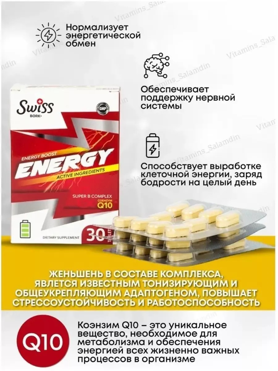 Мультивитаминный комплекс от Swiss BORK содержит в себе необходимые витамины и микроэлементы для возрождения жизненных сил и отличного самочувствия, в частности: - способствует нормальному энергетическому метаболизму; - способствует снижению усталости и утомления; - способствует поддержанию нормальной функции иммунной системы во время и после интенсивных физических упражнений; - способствует защите костей; - способствует поддержанию нормальной функции мышц. Витамины для женщин и мужчин Energy - это важнейшие добавки, которые восполнят недостаток витаминов и минералов, необходимые организму ежедневно, обеспечивая комплексую защиту для всей семьи. Бад повышает сопротивляемость инфекциям, укрепляет сосуды и сердце, обеспечивает поддержку нервной системы. Женьшень в составе комплекса, являясь известным тонизирующим и общеукрепляющим адаптогеном, повышает стрессоустойчивость и работоспособность. Коэнзим Q10 представляет собой витаминоподобное соединение, которое играет основную роль в выработке клеточной энергии и поддерживает здоровье сердечно-сосудистой системы.