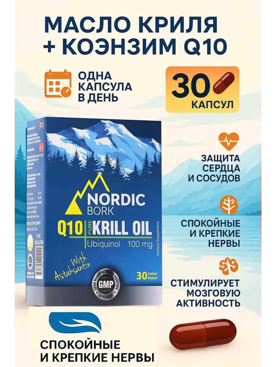 | Комплектация | Масло криля арктического; коэнзим Q10; убихинол; астаксантин; картонная коробка; блистеры; 30 мягких желатиновых капсул с маслом криля и коэнзим Q10 |