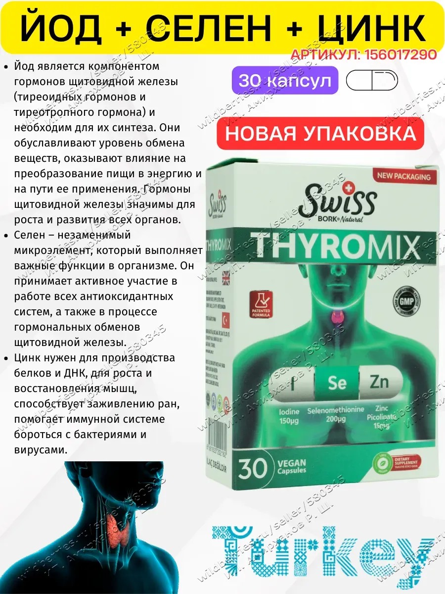 | Комплектация | картонная коробка; блистеры; 30 капсул с Йод Селениум Цинка пиколинат Swiss Bork THYROMIX |