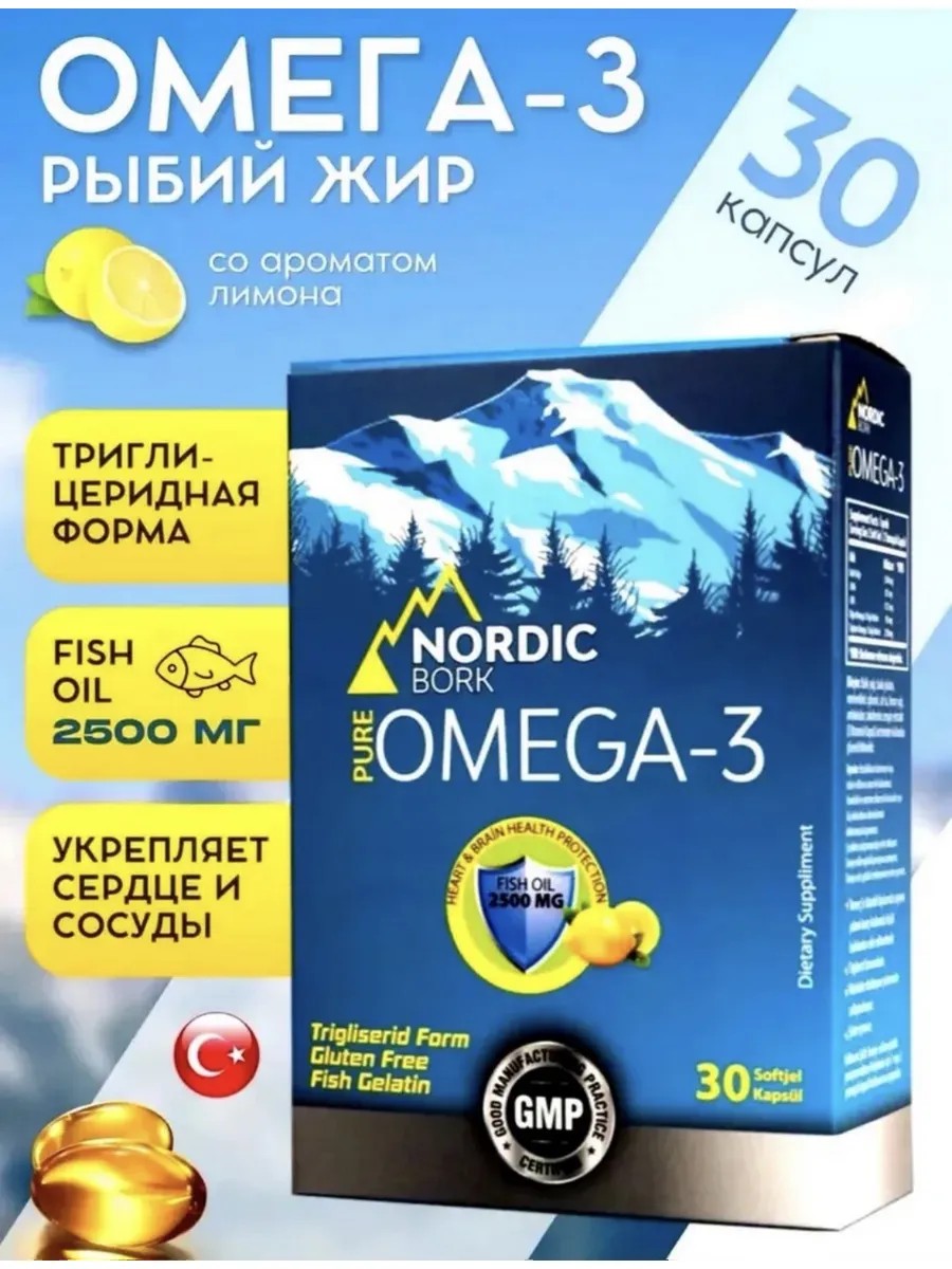 Если вы заботитесь о здоровье сердца, сосудов и мозга — этот рыбий жир с высокой дозировкой в 2500 мг станет вашей повседневной поддержкой. В составе: мощные формы ДГК и ЭПК (875 и 1125 мг), необходимые для работы мозга, памяти, настроения, концентрации и крепкого сердца. Благодаря триглицеридной форме, Омега-3 усваивается максимально эффективно и без побочных эффектов. Подходит взрослым и подросткам, не содержит ГМО, красителей и консервантов. Вкус лимона полностью устраняет неприятный запах рыбьего жира. Продукт изготовлен в Турции по мировым стандартам качества, GMP-сертифицирован и упакован в удобную форму 30 капсул. Поддержите своё здоровье с качественной Омега-3, которая действительно работает.