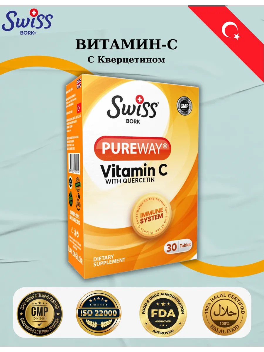 Swiss Bork Vitamin C Pureway is a high-quality dietary supplement containing vitamin C in the form of Pureway-C, which provides maximum bioavailability and long-lasting action.