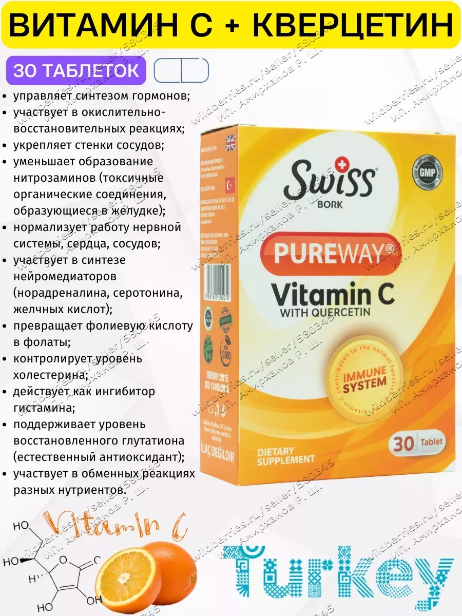 и свойства: Витамин С (PureWay) – 1000 мг: PureWay-C — это запатентованная форма витамина С, отличающаяся улучшенными биодоступностью и эффективностью по сравнению с традиционными формами аскорбиновой кислоты. Вот несколько ключевых особенностей PureWay-C: Особенности PureWay-C Улучшенная биодоступность: PureWay-C быстрее и эффективнее усваивается организмом, обеспечивая более высокую концентрацию витамина С в крови по сравнению с обычной аскорбиновой кислотой. Продолжительное действие: Благодаря специальной липидной матрице, PureWay-C обеспечивает продолжительное высвобождение витамина С, что помогает поддерживать стабильный уровень витамина в крови на протяжении более длительного времени. Меньшее раздражение желудка: PureWay-C менее кислый и мягче воздействует на желудок по сравнению с традиционной аскорбиновой кислотой. Усиленная антиоксидантная защита: Исследования показывают, что PureWay-C более эффективно защищает клетки от окислительного стресса, чем обычные формы витамина С. Это связано с улучшенной абсорбцией и распределением по тканям. Кверцетин – 100 мг: Кверцетин – это флавоноид, обладающий сильными антиоксидантными и противовоспалительными свойствами. Он помогает снизить воспаление, укрепить иммунную систему и улучшить общее состояние сосудов. Кверцетин также известен своими антигистаминными свойствами, что делает его полезным для людей с аллергическими реакциями. Цитрусовые биофлавоноиды – 50 мг: Цитрусовые биофлавоноиды – это группа растительных соединений, которые обычно содержатся в цитрусовых фруктах. Они усиливают действие витамина С, способствуют улучшению кровообращения и укреплению капилляров. Собачий шиповник – 50 мг: Собачий шиповник – это плод растения шиповник, который богат витамином С и другими антиоксидантами. Он способствует укреплению иммунной системы, улучшает состояние кожи и поддерживает здоровье суставов. Преимущества: Укрепление иммунной системы: Витамин С и кверцетин помогают улучшить защитные функции организма, снижая риск инфекций и заболеваний. Антиоксидантная защита: Компоненты данного состава защищают клетки от повреждений свободными радикалами, замедляя процессы старения и снижая риск хронических заболеваний. Противовоспалительное действие: Кверцетин и собачий шиповник помогают снизить воспалительные процессы в организме, улучшая общее состояние здоровья. Улучшение состояния сосудов: Цитрусовые биофлавоноиды и кверцетин способствуют укреплению сосудов и капилляров, улучшая кровообращение и снижая риск сердечно-сосудистых заболеваний. Способы и время приема: Для достижения максимального эффекта рекомендуется принимать по 1 таблетке в день, желательно во время еды. Это улучшает усвоение активных компонентов и минимизирует риск раздражения желудка. Если у вас есть особые медицинские показания или хронические заболевания, перед началом приема данной добавки рекомендуется проконсультироваться с врачом.
