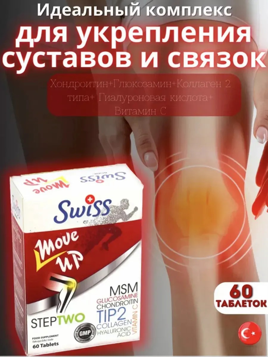 Витаминный комплекс MOVE UP step two направлен на поддержку здоровья суставов, волос, кожи, ногтей. Глюкозамин-Хондроитин-MSM с коллагеном 2 типа улучшит обменные процессы в хрящевой ткани, замедлит разрушение костной ткани и уменьшит боль в суставах и позвоночнике. Глюкозамин - ключевой ингредиент средств для ухода за суставами, поскольку он обеспечивает поддержку здоровья хрящей вокруг суставов. Хондроитин естественным образом присутствует во многих тканях организма и является особенно важным компонентом суставных хрящей и синовиальной оболочки. МСМ - это органическое серосодержащее соединение, выступающее в роли противовоспалительного агента при здоровья суставов. Экстракт корня солодки обладает противовоспалительным действием, а также поддерживает здоровье слизистой при воспалительных заболеваниях ЖКТ. Коллаген 2 типа поддерживает здоровую функцию суставов, комфортное движение и прочность соединительной ткани. Гиалуроновая кислота - это соединение, присутствующее во всех тканях организма, при чем в самых высоких концентрациях оно встречается в соединительных тканях, таких как кожа и хрящи. Гиалуроновая кислота - важный компонент суставной жидкости, она поддерживает гидратацию, эластичность и микроциркуляцию жидкости в здоровых суставах.