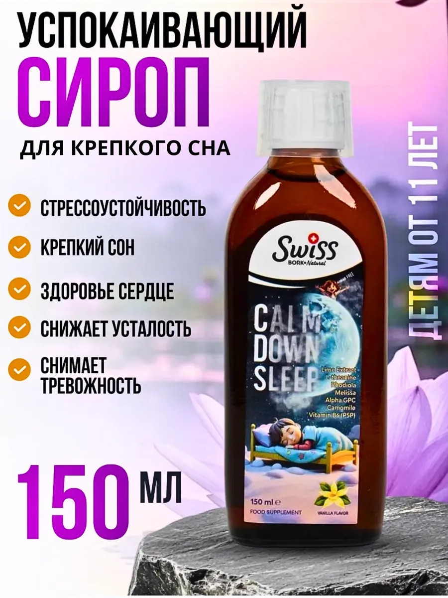 | Комплектация | картонная коробка; Стеклянный флакон с крышкой; Мерный пластиковый стакан; 150 мл сиропа для нормализации сна детский; Swiss Bork CALM DOWN SLEEP |