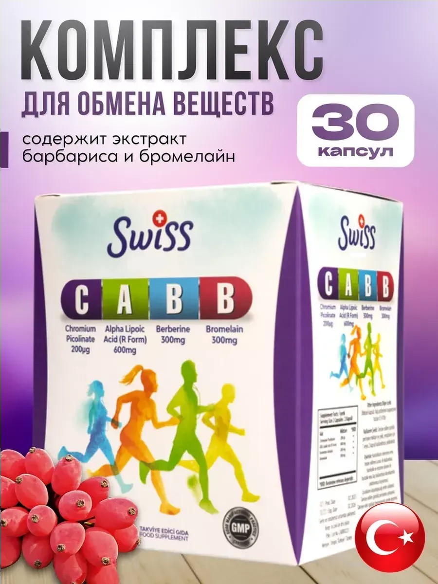 Swiss CABB is an effective capsule complex designed to support the health of both men and women. This Turkish-made product contains four key ingredients, each with its own unique properties and optimizes metabolism. Chromium picolinate plays a key role in regulating blood glucose and carbohydrate levels. This mineral improves cellular sensitivity to insulin. This is especially beneficial for those with diabetes or sugar issues. Alpha lipoic acid is a powerful antioxidant and neutralizes free radicals. Berberine promotes weight loss, cleanses, and reduces the risk of heart disease. Bromelain is a natural detoxifying enzyme derived from pineapple, known for its anti-inflammatory properties. It improves digestion and absorption. These supplements normalize cholesterol, accelerate metabolism, improve eating habits, provide appetite control, and aid in weight loss. This multivitamin is beneficial for the cardiovascular system, boosts energy, and improves brain function. It contains all the necessary elements to help you lose weight and boost your immune system. This product is not recommended for pregnant women, nursing mothers, young children, or those with any known intolerance to any of the ingredients. This vitamin tablet is suitable for adult men and women. Don't miss the opportunity to become healthier and slimmer. Order this blocker today and see for yourself how effective it is. This detox supplement from a Turkish brand is a reliable aid in achieving your ideal figure, beauty, and well-being!