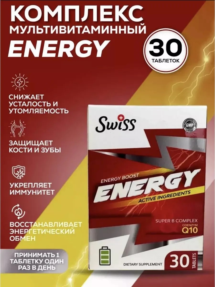 Мультивитаминный комплекс от Swiss содержит в себе необходимые витамины и микроэлементы для возрождения жизненных сил и отличного самочувствия, в частности: Способствует нормальному энергетическому метаболизму; Способствует снижению усталости и утомления; Способствует поддержанию нормальной функции иммунной системы во время и после интенсивных физических упражнений; Способствует защите костей; Способствует поддержанию нормальной функции мышц. Женьшень в составе комплекса, являясь известным тонизирующим и общеукрепляющим адаптогеном, повышает стрессоустойчивость и работоспособность. Коэнзим Q10 представляет собой витаминоподобное соединение, которое играет основную роль в выработке клеточной энергии и поддерживает здоровье сердечно-сосудистой системы. Рекомендации по применению. Принимать по 1 таблетке один раз в день. Кол-во порций в упаковке 30. Размер одной порции 1 таблетка.Активные вещества на 1 порцию