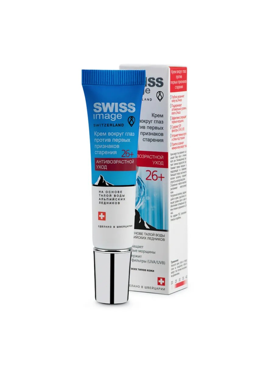 Swiss Image средства по уходу лица направлены на поддержание молодости, красоты и здорового вида Вашей кожи. Каждое средство содержит натуральные активные ингредиенты и в сочетании с другими средствами линии дарит Вам непревзойденный результат.Крем вокруг глаз увлажняет и защищает Вашу кожу в течение всего дня. Разглаживает мимические морщинки, освежает хрупкую кожу вокруг глаз.Инновационный экстракт снежных водорослей разглаживает первые морщины и предупреждает их появление. Уменьшает потерю эластичности волокон коллагена, сохраняет упругость и молодой вид кожи.Ниацинамид или витамин В3 активный компонент для обновления кожи на клеточном уровне. Он улучшает эластичность кожи и её барьерную функцию, стимулирует синтез коллагена, выработку кожных церамидов и липидов. С помощью этого витамина вырабатывается кожный иммунитет к воздействию внешней агрессивной среды.Экстракт коры ясеня — известный компонент для повышения упругости кожи, используется для ухода за кожей век. Содержащиеся в нем танин, кумарины, эфирные масла, способные повышать тонус тканей.Экстракт семян проса стимулируется обновление клеток кожи, восстанавливает липидный барьер и способствует сохранению уровня увлажненности, эластичности и упругости кожи.Глубоко увлажняет кожу на 24 часа.Поддерживает оптимальный уровень влаги 24 часа.Эффективно сокращает первые морщины.Содержит SPF фильтры (UVA/UVB).Устраняет темные круги и отеки под глазами.Приятно освежает нежную кожу вокруг глаз.Крем вокруг глаз увлажняет и защищает Вашу кожу в течение всего дня.Инновационный экстракт снежных водорослей разглаживает первые морщины и предупреждает их появление.Уменьшает потерю эластичности волокон коллагена, сохраняет упругость и молодой вид кожи.Специальный лифтинг-комплекс разглаживает микро-рельеф кожи.Натуральный комплекс, содержащийся в креме, существенно повышает уровень питания и увлажнения на 24 часа.