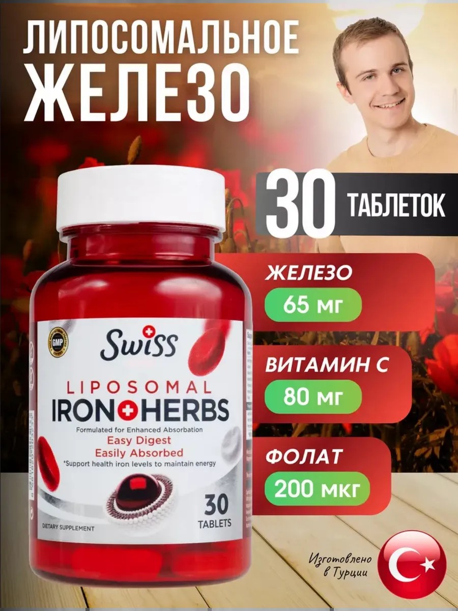 Liposomal Iron supplements from the Turkish brand Swiss are an effective product designed to maintain optimal levels of this important mineral in the body. Iron bisglycinate is an easily absorbed form. It is used to prevent and treat mild iron deficiency anemia, improve hemoglobin levels, immunity, and performance.