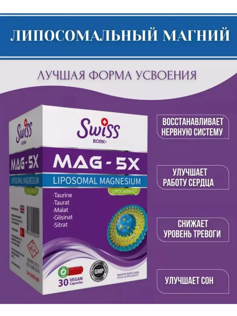 MAG - 5X от Swiss bork - это оригинальные и качественные спортивные биодобавки, разработанные в Турции с использованием высококачественных ингредиентов. Этот витаминно-минеральный комплекс содержит различные формы магния, такие как магний цитрат, глицинат, малат и таурат, в органической форме, обогащенный витамином B6. MAG - 5X способствует укреплению здоровья сердца, поддерживает нервную систему и мышцы, помогает в управлении стрессом и тревогой. Этот водорастворимый органический комплекс помогает предотвращать судороги в ногах и устранять усталость. Кроме того, он поддерживает здоровье сосудов, суставов и связок, улучшает зубы, кости, глаза, ногти, кожу, способствует хорошему сну и повышению иммунитета. Эти бады подходят для взрослых, подростков, мужчин, женщин, а также пожилых людей. MAG - 5X - ваш надежный спутник для укрепления организма, улучшения физической активности, повышения энергии, улучшения памяти и красоты. Это идеальный выбор для спортсменов и всех, кто ценит свое здоровье и благополучие. Кроме того, MAG - 5X может быть вашим антистрессовым союзником и помочь в борьбе с депрессией благодаря его антидепрессантным свойствам. Способ применения: Рекомендуемое суточное количество и форма порции - 1-2 капсулы для взрослых через 60 минут после еды, чтобы достичь максимальной пользы для вашего организма.