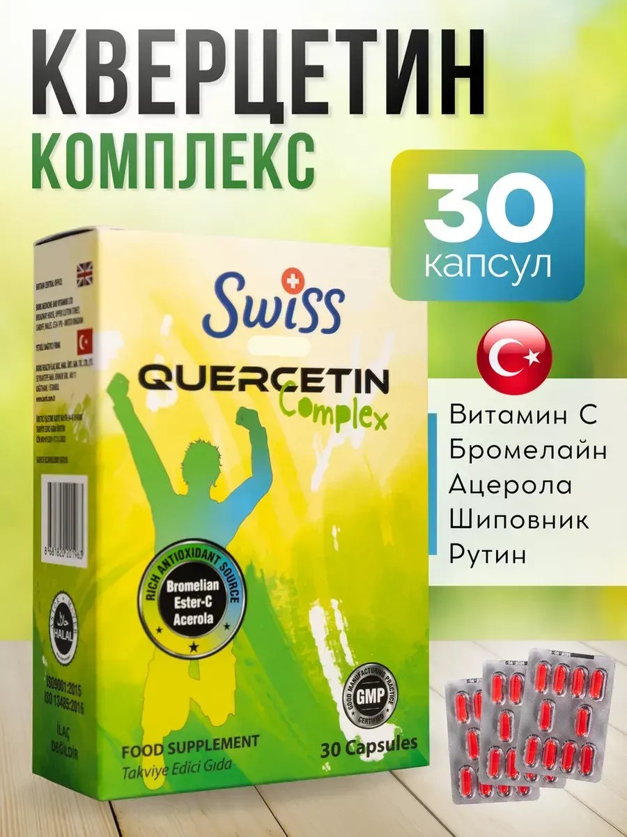 Swiss Quercetin Complex - удивительные комплексные бады в капсулах, произведенные в Турции и сочетающие в себе группу лучших ингредиентов для поддержания крепкого здоровья, включая витамины и минералы. Один из ключевых компонентов пищевой добавки - кверцетин 500мг, известный нецитрусовый биофлавоноид. Является мощным антиоксидантом с антивоспалительными свойствами. Защищает клетки от повреждения свободными радикалами, укрепляет иммунитет и способствует общему оздоровлению организма. Витаминный комплекс содержит vitamin С - важный элемент для поддержки хорошего состояния кожи, суставов, сердца и иммунной системы. Аскорбиновая кислота улучшает усвоение железа и участвует в выработке коллагена. Бромелайн - фермент, способствующий налаживанию пищеварения и уменьшению отечности. Ацерола и шиповник, содержащиеся в биодобавке, обогащают человека необходимыми питательными веществами и повышают энергию. Рутин имеет сосудосуживающее действие. Помогает укрепить стенки кровеносных сосудов и наладить кровообращение. Поливитамин с дигидрокверцетином рекомендуется для взрослых мужчин, женщин, пожилых и подростков. Беременным девушкам, детям и кормящим мамам перед приемом таблеток следует проконсультироваться с врачом. Турецкий бад обезопасит вас от вирусных и инфекционных заболеваний. Мультивитамин - отличный выбор для людей, стремящихся быть всегда в тонусе. Добавляйте этот продукт в свой рацион питания и наслаждайтесь превосходными результатами и прекрасным самочувствием!