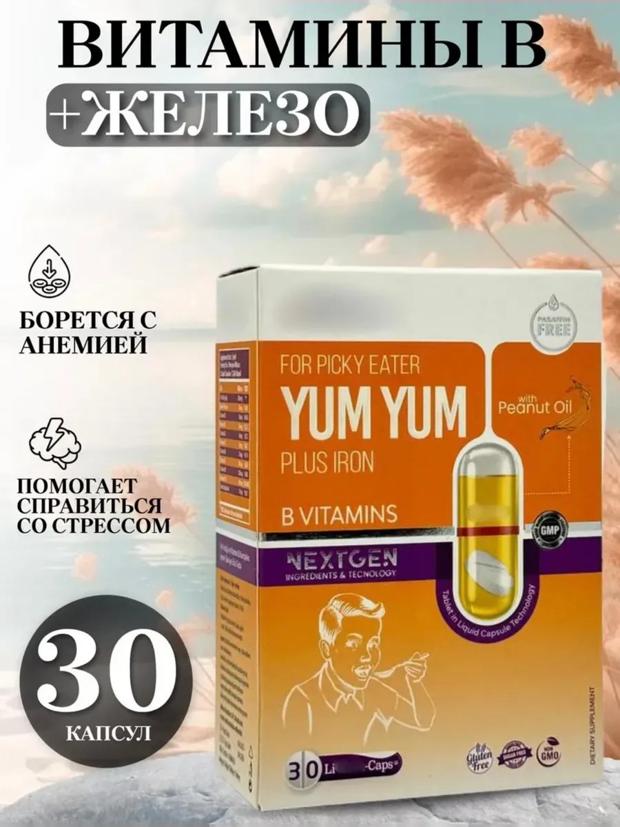 | Комплектация | картонная коробка; блистеры; 30 капсул с Витаминами группы Б, Железом и Цинком Britain Bork YUM YUM |