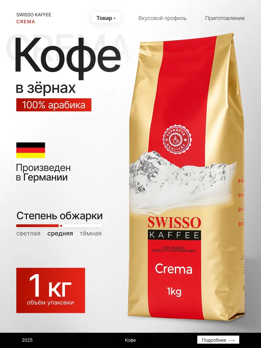 | Комплектация | натуральный зерновой кофе; Свежеобжаренный кофе; Кофе в зернах 1 кг; Кофе Swisso CREMA; немецкий кофе |