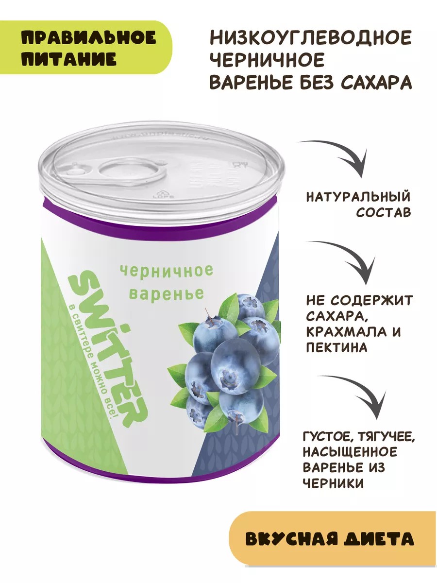 Варенье без сахара Switter - это продукт с абсолютно чистым составом: без ароматизаторов, без консервантов, без фруктозы. Натуральный подсластитель изомальтоолигосахарид, является так же приботиком. Густое, насыщенное и тягучее, такое каким должно быть настоящее варенье. Уникальная технология изготвления позволяет сохранить все полезные свойсва ягод и вкус, а так же получить густую и тягучую текстуру без использования крахмала, пектина и прочих загустителей. Продукты без сахара Switter сделают Вашу диету более приятной, так как это диетические продукты для похудения, низкоуглеводные продукты и низкокалорийные продукты. Наши десерты отлично подойдут как: продукты для прпавильного питания, здоровый и полезный перекус, сладости в подарок, Дюкан продукты, здоровое питание на каждый день, полезные сладости для детей, диетическое питание для похудения. Обратите Внимание, что наши полезные, диетические сладости относятся в первую очередь к ПП продуктам, а не к продуктам для диабетиков. Состав: изомальтоолигосахарид, черника. Пищевая и энергетическая ценность на 100г: усваиваемая 47,6 ккал, общая 187,6 ккал, 0,8 г белки, 0,4 г жиры, 10,2 г углеводы, 70 г пищевое волокно.