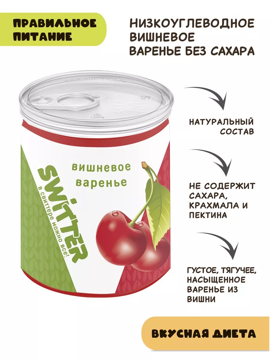 Варенье без сахара Switter - это продукт с абсолютно чистым составом: без ароматизаторов, без консервантов, без фруктозы. Натуральный подсластитель изомальтоолигосахарид, является так же приботиком. Густое, насыщенное и тягучее, такое каким должно быть настоящее варенье. Уникальная технология изготвления позволяет сохранить все полезные свойсва ягод и вкус, а так же получить густую и тягучую текстуру без использования крахмала, пектина и прочих загустителей. Продукты без сахара Switter сделают Вашу диету более приятной, так как это диетические продукты для похудения, низкоуглеводные продукты и низкокалорийные продукты. Наши десерты отлично подойдут как: продукты для прпавильного питания, здоровый и полезный перекус, сладости в подарок, Дюкан продукты, здоровое питание на каждый день, полезные сладости для детей, диетическое питание для похудения. Обратите Внимание, что наши полезные, диетические сладости относятся в первую очередь к ПП продуктам, а не к продуктам для диабетиков. Состав: изомальтоолигосахарид, вишня. Пищевая и энергетическая ценность на 100г: усваиваемая 52,1 ккал, общая 192,1 ккал, 0,5 г белки, 0,1 г жиры, 12,3 г углеводы, 70 г пищевое волокно.