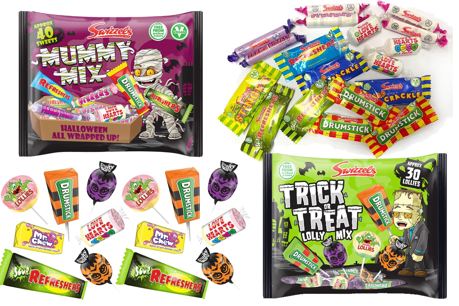 Trick or treat or on the go sweets. It can be a great gift for sharing with friends and family. 02 Mixed Packs. Swizzels Trick or Sweet Lolly Sweet Variety 330g. Swizzels Mummy Mix 40 Sweet Variety Pack 340g.
