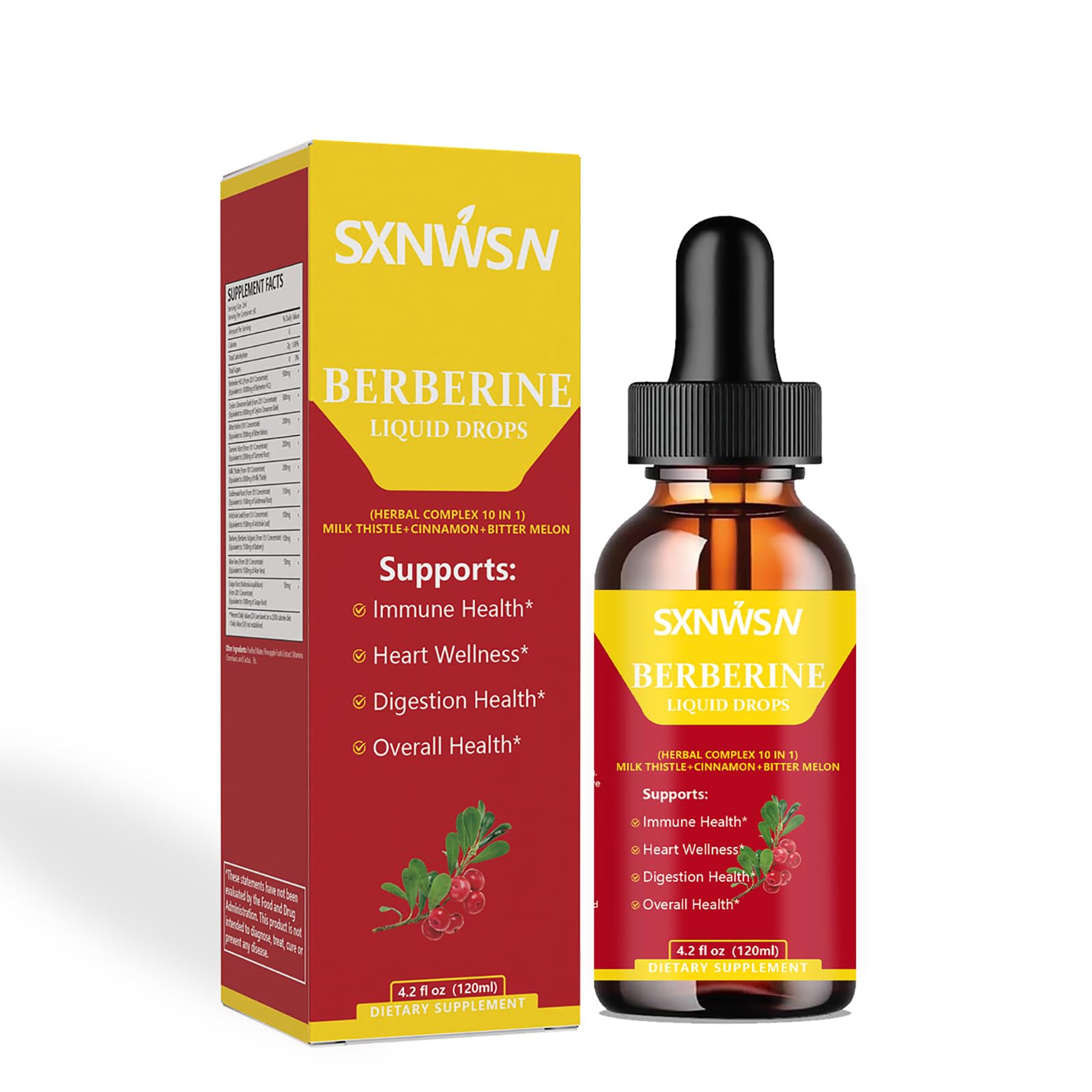 SXNWSN Berberine Drops - 10-in-1 Herbal Complex with Milk Thistle Ceylon Cinnamon & Bitter Melon | 4.2Fl Oz Liquid Supplement for Immune Heart & Digestive Support