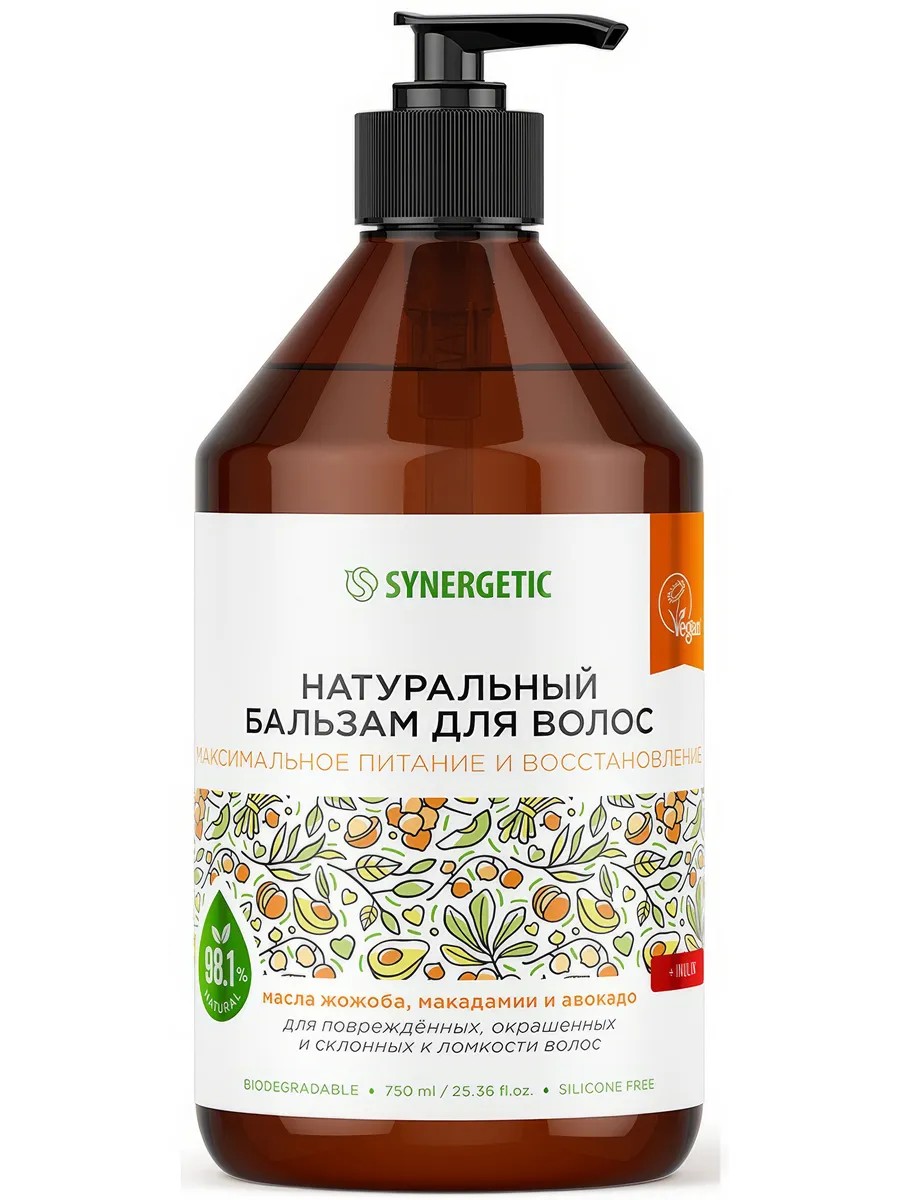 Бальзам Synergetic Максимальное питание и восстановление для поврежденных, окрашенных и склонных к ломкости волос, натуральный, 750 мл. Натуральный бальзам для волос SYNERGETIC Максимальное питание и восстановление - эффективное средство для ухода за поврежденными, окрашенными и склонными к ломкости волосами, более чем на 98% состоящее из натуральных компонентов. Формула на основе растительных компонентов возвращает волосам блеск и силу, питает и восстанавливает поврежденные, окрашенные и склонные к ломкости волосы. Активный кондиционирующий комплекс делает волосы эластичными, смягчает и увлажняет их. Комплекс натуральных масел жожоба, макадамии и авокадо интенсивно питает волосы и придает им здоровый блеск. Благодаря входящему в состав бальзама натуральному инулину волосы становятся более гладкими и ухоженными. Натуральные растительные эмоленты облегчают расчесывание волос и обеспечивают длительный кондиционирующий эффект. Они эффективно смягчают, делая волосы гладкими, блестящими и ухоженными. Состав: Aqua; Cetearyl Аlcohol (натуральный эмульгатор) ; Distearoylethyl Dimonium Chloride (кондиционер растительного происхождения) ; Cocos Nucifera Oil (масло кокоса) ; Olus Oil (смесь растительных масел) ; Glycerin (увлажняющий компонент растительного происхождения) ; Glyceryl Stearate (натуральный эмульгатор) ; Cetyl Esters (кондиционер растительного происхождения) ; Inulin (растительный пребиотик) ; Macadamia Integrifolia Seed Oil (масло макадамии) ; Simmondsia Chinensis Seed Oil (масло жожоба) ; Persea Gratissima Oil (масло авокадо) ; Panthenol (витамин B5) ; Saccharide Isomerate (натуральный увлажнитель) ; Guar Hydroxypropyltrimonium Chloride (кондиционирующий компонент) ; Hydroxyethylcellulose (натуральный стабилизатор) ; Lauryl Glucoside (мягкий ПАВ) ; Parfum (гипоаллергенная парфюмерная композиция) ; Dehydroacetic Acid, Benzyl Alcohol, Benzoic Acid (натуральные консерванты) ; Citric Acid, Sodium Citrate (регуляторы кислотности)
