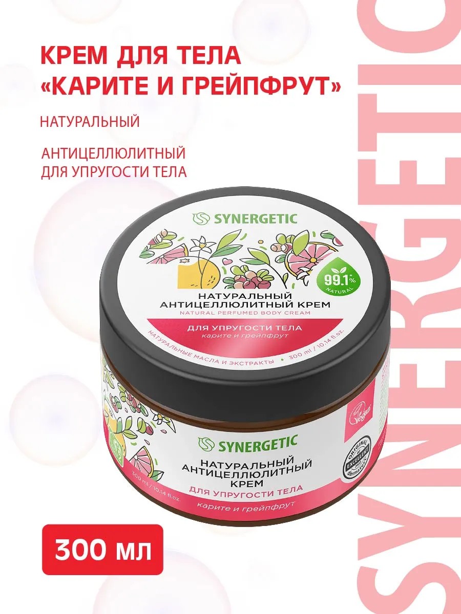 Крем для тела SYNERGETIC Карите и грейпфрут антицеллюлитный для упругости тела 300 мл. Натуральный антицеллюлитный крем SYNERGETIC для упругости тела питает, увлажняет, тонизирует, подтягивает кожу и дарит долговременное ощущение комфорта и мягкости. Активные компоненты крема в сочетании с изомератом сахарида обеспечивают сохранение влаги в коже, обладают регенерирующим действием и восстанавливают барьерные функции кожи. Масла карите, какао и кокоса способствуют улучшению тонуса и разглаживанию микрорельефа, а экстракты кофе и грейпфрута оказывают мощное антиоксидантное, регенерирующее и омолаживающее действие. Натуральный пребиотик трегалоза в сочетании с остальными компонентами помогает нормализовать и сохранить естественный микробиом кожи. Парфюмерная композиция с нотами грейпфрута и карите оставляет на коже нежный и приятный аромат на долгое время. Безопасная формула с высокой концентрацией натуральных компонентов не содержит парабенов, минеральных масел, силиконов, красителей и компонентов животного происхождения. Крем не тестируется на животных и сертифицирован британской организацией The Vegan Society. Знак Vegan - мировой стандарт этичной продукции. Дерматологически протестирован независимым институтом Dermatest в Германии. Состав: Aqua, Glycerin, Cetearyl Alcohol, Potassium Cetyl Phosphate, Butyrospermum Parkii Butter, Glyceryl Stearate, Cocos Nucifera Oil, Caprylic/Capric Triglyceride, Coco-Caprylate/Caprate, Isoamyl Laurate, Stearic Acid, Palmitic Acid, Caffeine, Theobroma Cacao Seed Butter, Citrus Grandis Fruit Extract, Coffea Arabica Seed Extract, Caprylyl Glycol, Propanediol, Niacinamide, Tocopheryl Acetate, Trehalose, Saccharide Isomerate, Citric Acid, Sodium Citrate, Polyglyceryl-10 Laurate, Xanthan Gum, Parfum, Potassium Hydroxide, Benzoic Аcid, Sodium Benzoate, Potassium Sorbate.