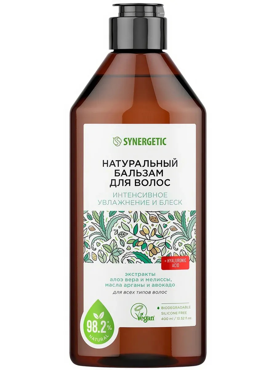 Бальзам Synergetic Интенсивное увлажнение и блеск для волос, натуральный, для всех типов волос, 400 мл. Натуральный бальзам для волос SYNERGETIC Интенсивное увлажнение и блеск - эффективное средство для ухода за всеми типами волос, более чем на 98% состоящее из натуральных компонентов. Формула бальзама на основе растительных компонентов оказывает комплексное воздействие на структуру волос. Активный кондиционирующий комплекс придает волосам эластичность, смягчает и увлажняет их. Гиалуроновая кислота создает идеальный баланс увлажненности, придает волосам здоровое сияние. Комплекс натуральных масел арганы и авокадо оказывает восстанавливающее действие, питает и укрепляет волосы по всей длине, а экстракты алоэ и мелиссы придают им эластичность и блеск. Натуральные растительные эмоленты облегчают расчесывание волос и обеспечивают длительный кондиционирующий эффект. Они эффективно смягчают, делая волосы гладкими, блестящими и ухоженными. Состав: Aqua; Cetearyl Аlcohol (натуральный эмульгатор) ; Glycerin (увлажняющий компонент растительного происхождения) ; Distearoylethyl Dimonium Chloride (кондиционер растительного происхождения) ; Cocos Nucifera Oil (масло кокоса) ; Olus Oil (смесь растительных масел) ; Cetyl Esters (кондиционер растительного происхождения) ; Aloe Barbadensis Leaf Juice (экстракт алоэ) ; Melissa Оfficinalis Flower/Leaf/Stem Extract (экстракт мелиссы) ; Glyceryl Stearate (натуральный эмульгатор) ; Argania Spinosa Kernel Oil (масло арганы) ; Persea Gratissima Oil (масло авокадо) ; Saccharide Isomerate (натуральный увлажнитель) ; Guar Hydroxypropyltrimonium Chloride (кондиционирующий компонент) ; Hydroxyethylcellulose (натуральный стабилизатор) ; Sodium Hyaluronate (гиалуроновая кислота) ; Dehydroacetic Acid, Benzyl Alcohol, Benzoic Acid, Potassium Sorbate (натуральные консерванты) ; Lauryl Glucoside (мягкий ПАВ) ; Parfum (гипоаллергенная парфюмерная композиция) ; Citric Acid, Sodium Citrate (регуляторы кислотности)