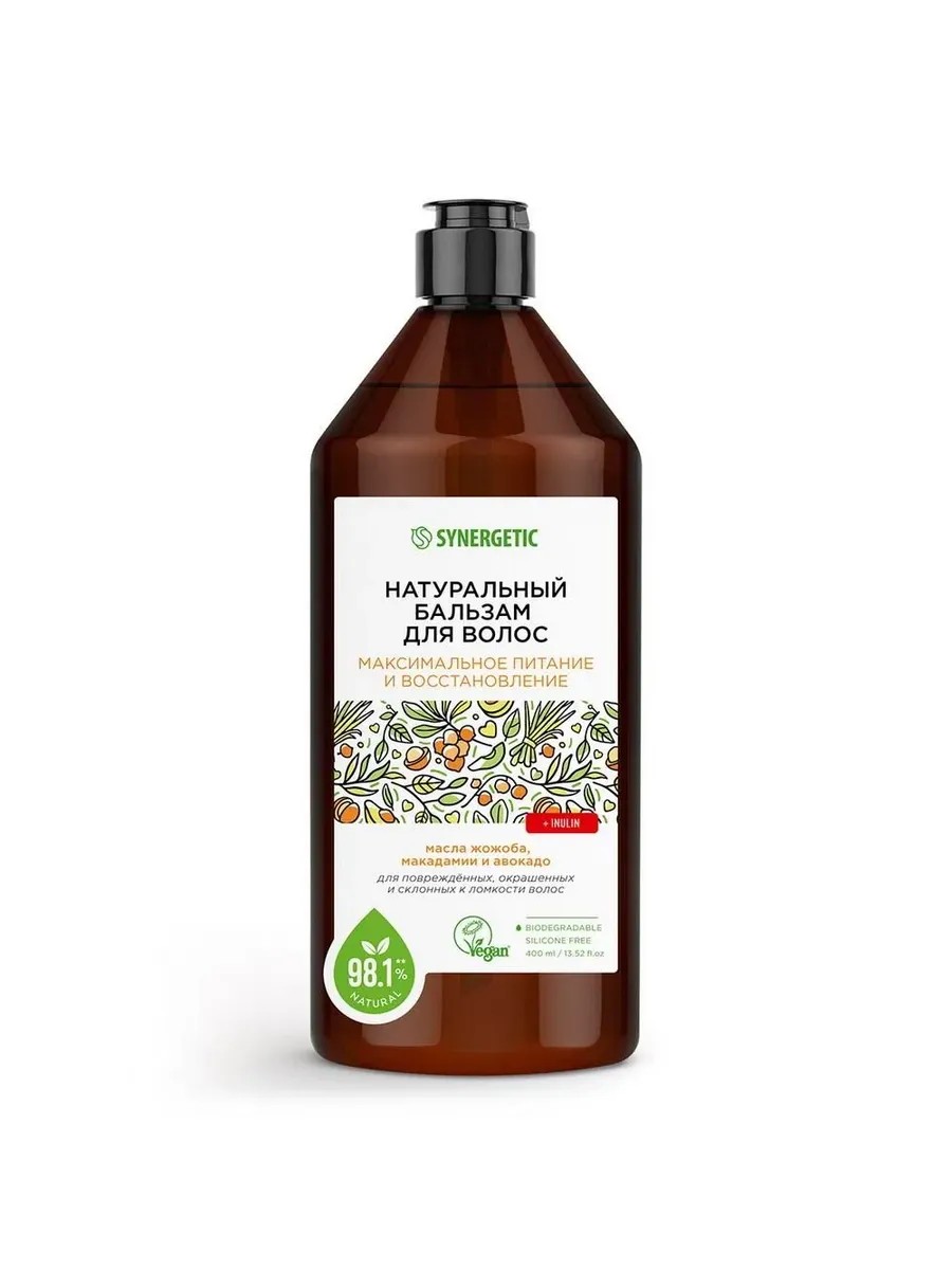 Натуральный бальзам для волос SYNERGETIC Максимальное питание и восстановление эффективное средство для ухода за поврежденными, окрашенными и склонными к ломкости волосами более чем на 98% состоит из натуральных компонентов. Формула на основе растительных компонентов без силиконов питает и восстанавливает поврежденные, окрашенные и склонные к ломкости волосы, возвращая им блеск и силу. Активный кондиционирующий комплекс делает волосы эластичными, смягчает и увлажняет. Бальзам содержит масла жожоба, макадамии и авокадо, которые интенсивно питают и придают здоровый блеск волосам, а натуральный инулин делает их более гладкими и ухоженными. Натуральный пребиотик в составе бальзама восстанавливает естественный баланс микробиома кожи головы и защищает от негативных факторов окружающей среды. Благодаря инновационному составу кожа головы остается увлажненной до 72 часов. Натуральный бальзам не содержит силиконов, парабенов, минеральных масел, красителей, компонентов животного происхождения, не тестируется на животных и сертифицирован британской организацией The Vegan Society. Знак Vegan мировой стандарт этичной продукции.