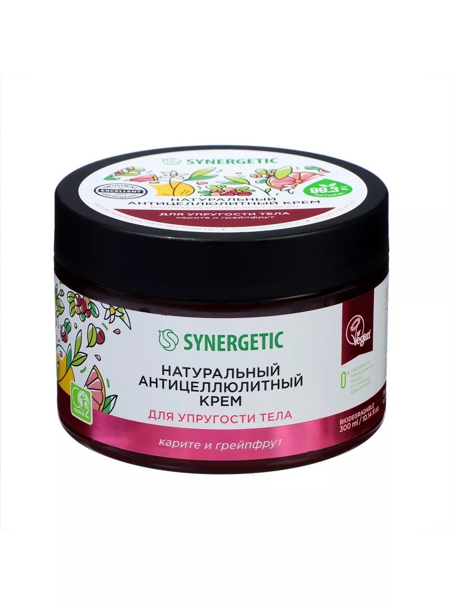 Крем для тела Synergetic Натуральный, антицеллюлитный, для упругости, 300 г (800012). Натуральный антицеллюлитный крем Synergetic для упругости тела питает, увлажняет, тонизирует, подтягивает кожу и дарит долговременное ощущение комфорта и мягкости. Активные компоненты крема в сочетании с изомератом сахарида обеспечивают сохранение влаги в коже, обладают регенерирующим действием и восстанавливают барьерные функции кожи. Масла карите, какао и кокоса способствуют улучшению тонуса и разглаживанию микрорельефа, а экстракты кофе и грейпфрута оказывают мощное антиоксидантное, регенерирующее и омолаживающее действие. Натуральный пребиотик трегалоза в сочетании с остальными компонентами помогает нормализовать и сохранить естественный микробиом кожи. Парфюмерная композиция с нотами грейпфрута и карите оставляет на коже нежный и приятный аромат на долгое время. Безопасная формула с высокой концентрацией натуральных компонентов не содержит парабенов, минеральных масел, силиконов, красителей и компонентов животного происхождения. Крем не тестируется на животных и сертифицирован британской организацией The Vegan Society. Знак Vegan - мировой стандарт этичной продукции. Дерматологически протестирован независимым институтом Dermatest в Германии. Нанести крем на чистую сухую кожу проблемных зон до полного впитывания. Для ежедневного применения. Только для наружного применения. Беречь от детей. При попадании средства в глаза промыть водой. Использовать строго по назначению