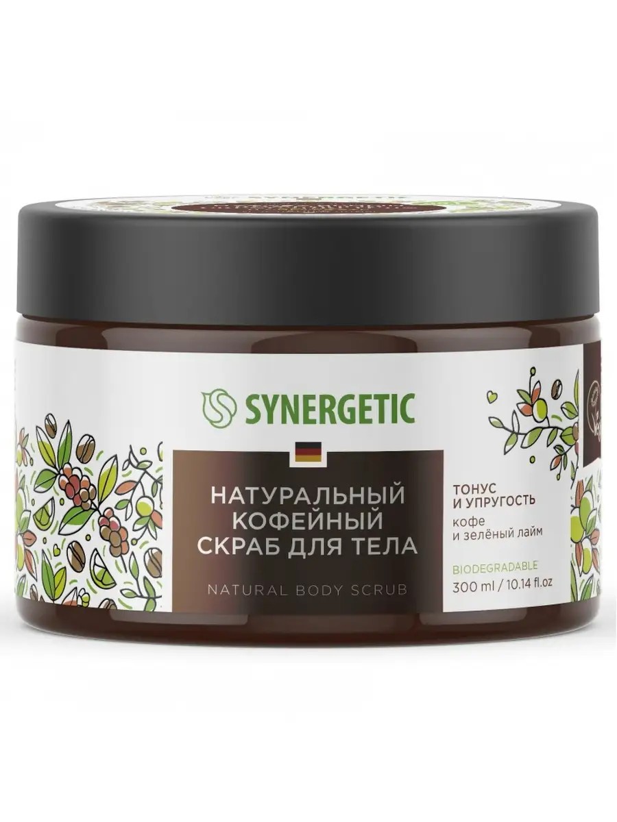 Скраб для тела Synergetic тонус и упругость "Кофе и зеленый лайм" кофейный натуральный 300 мл. Натуральный кофейный скраб для тела Synergetic тонус и упругость, кофе и зеленый лайм - это эффективное средство для ухода за кожей, более чем на 99% состоящее из натуральных компонентов. Скраб деликатно отшелушивает и очищает кожу. Аромат натурального кофейного скраба для тела Synergetic с нотами лайма, кофе, ореха и карамели оставляет на коже изысканный аромат. Натуральный скраб не содержит SLS, SLES, парабенов, силиконов, минеральных масел и красителей, а также компонентов животного происхождения, не тестируется на животных и сертифицирован британской организацией The Vegan Society.