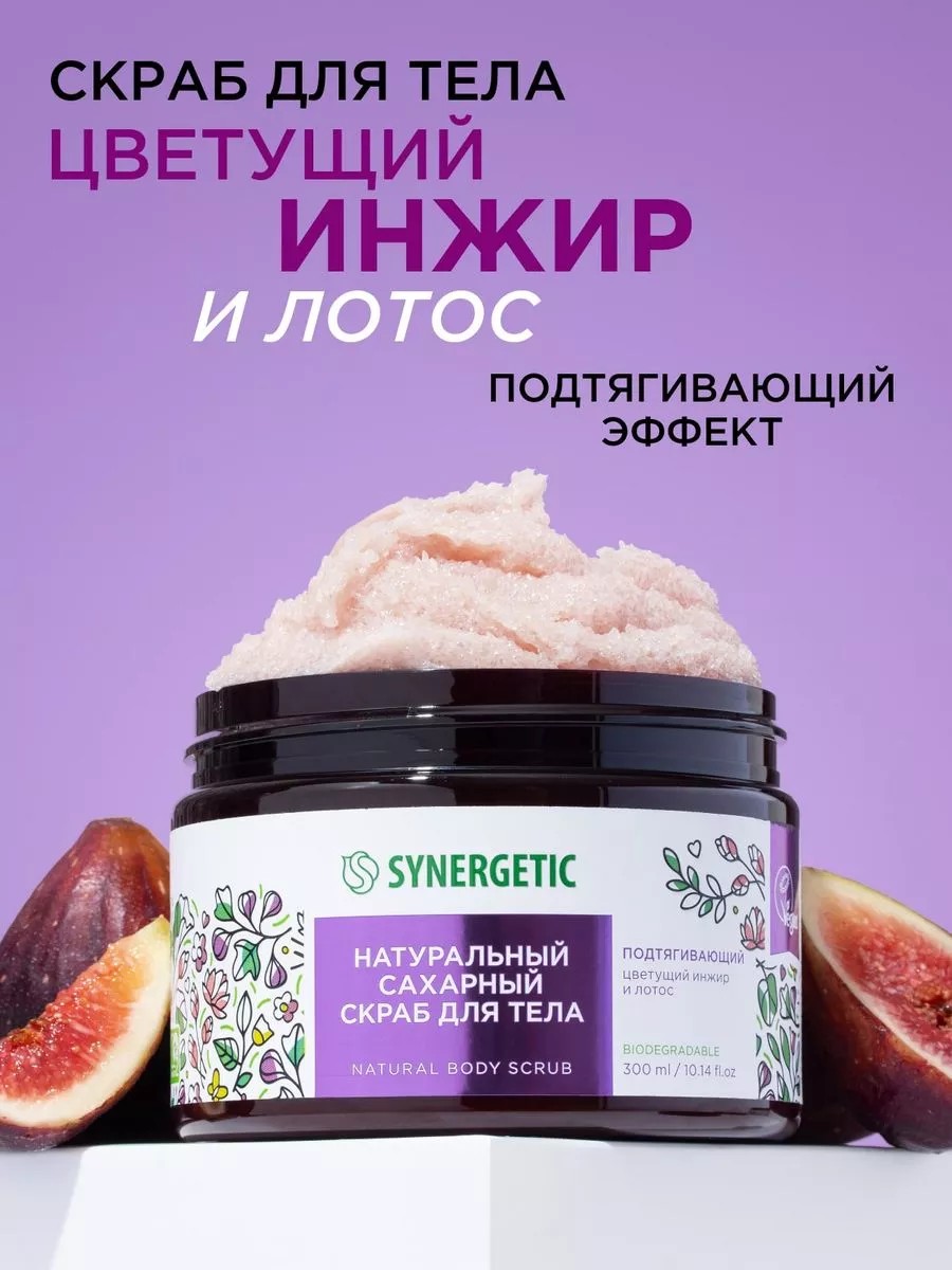 Натуральный сахарный скраб для тела SYNERGETIC подтягивающий, цветущий инжир и лотос – это эффективное средство для ухода за кожей, более чем на 99% состоящее из натуральных компонентов.