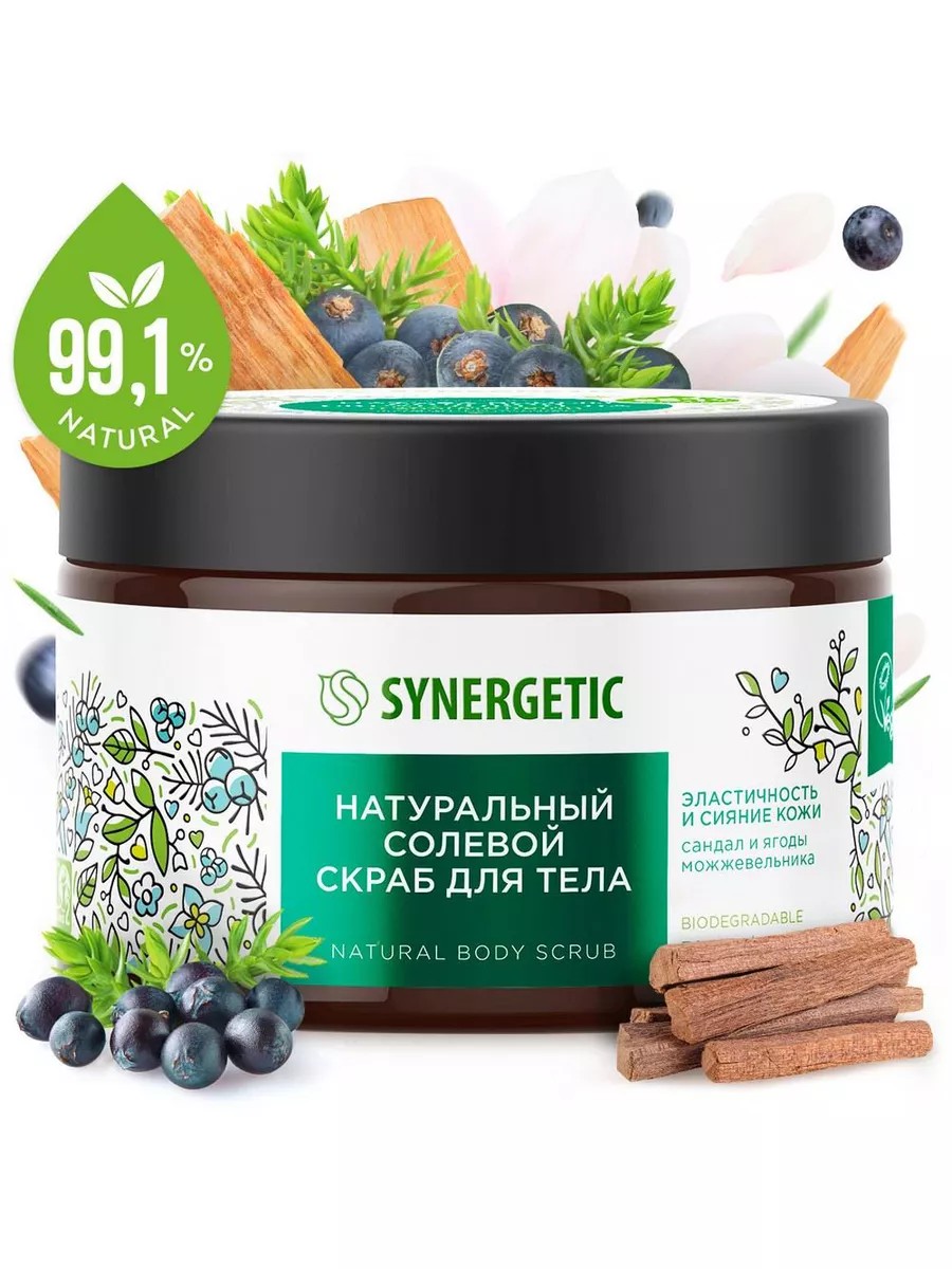 Synergetic Body Scrub for Skin Elasticity and Radiance, Sandalwood and Juniper Berries, 300 ml. This natural salt body scrub, SYNERGETIC for skin elasticity and radiance, with sandalwood and juniper berries, is an effective skin care product made from over 99% natural ingredients. The scrub gently exfoliates and cleanses the skin. Shea butter has a regenerating effect, nourishes, and moisturizes, leaving the skin smooth and velvety. A complex of coconut and sweet almond oils has a powerful toning effect, adding elasticity and radiance to the skin. Sandalwood and juniper extracts moisturize the skin. The hypoallergenic perfume composition was developed by the Swiss house of Givaudan. The scent of SYNERGETIC natural body scrub with patchouli, cistus, geranium, gurjum, and pink pepper oils leaves a delightful scent on the skin. This natural scrub is free of SLS, SLES, parabens, silicones, mineral oils, and dyes, as well as animal-derived ingredients. It is cruelty-free and certified by The Vegan Society. Ingredients: Sodium Chloride (salt), Glycerin* (plant-based humectant), Cetearyl Alcohol* (natural thickener), Butyrospermum Parkii Butter* (shea butter), Aqua (water), Prunus Armeniaca Seed Powder* (ground apricot kernel), Sweet Almond Oil Polyglyceryl - 4 Esters* (almond oil), Cocos Nucifera Fruit Oil* (coconut oil), Santalum Album (Sandalwood) Wood Extract* (sandalwood extract), Juniperus Communis Fruit / Leaf Water (juniper extract), Cocamidopropyl Betaine* (mild surfactant from coconut oil), Lecithin*, Tocopherol*, Ascorbyl Palmitate*, Hydrogenated Palm Glycerides Citrate (natural antioxidant complex), Parfum (perfume composition based on essential oils). * ECOCERT approval; Volume: 300; Area of use: Body; Skin type: For normal skin;