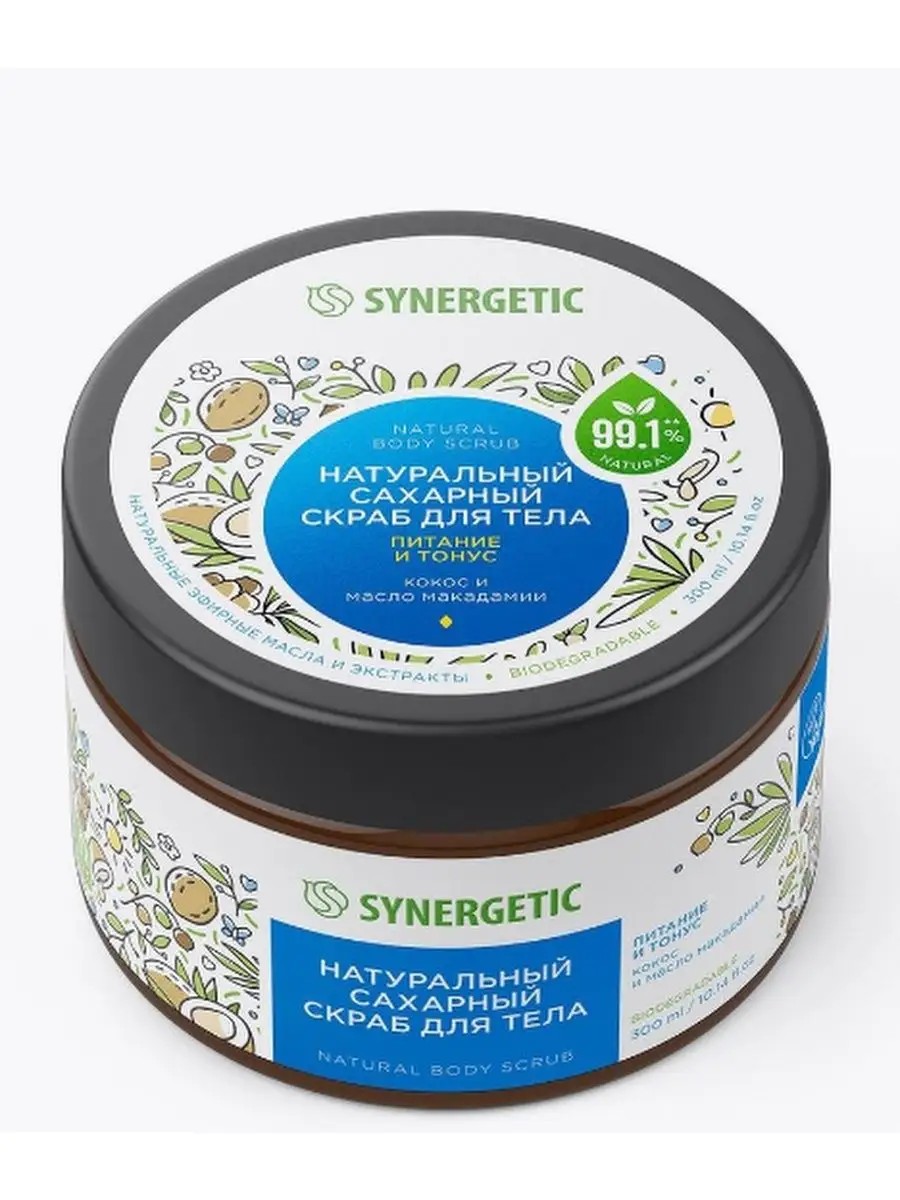 Скраб для тела SYNERGETIC Питание и тонус, Кокос и масло макадамии, натуральный сахарный, 300мл – это эффективное средство для ухода за кожей, более чем на 99% состоящее из натуральных компонентов. Скраб деликатно отшелушивает кожу и оказывает массажный эффект. Масло кокоса в сочетании с кокосовой стружкой тонизируют кожу и придают ей упругость, а масло миндаля оказывает регенерирующее действие. Масло карите интенсивно питает, а экстракт франжипани и гилауроновая кислота увлажняют и ухаживают за кожей, делая ее гладкой и бархатистой. Гипоаллергенная парфюмерная композиция разработана в швейцарском доме Givaudan, где уже более ста лет создают ароматы, которые используются во всем мире в парфюмерии и косметике. Аромат натурального сахарного скраба для тела SYNERGETIC с нотами кокоса, ванили и орехов оставляет на коже изысканный аромат.