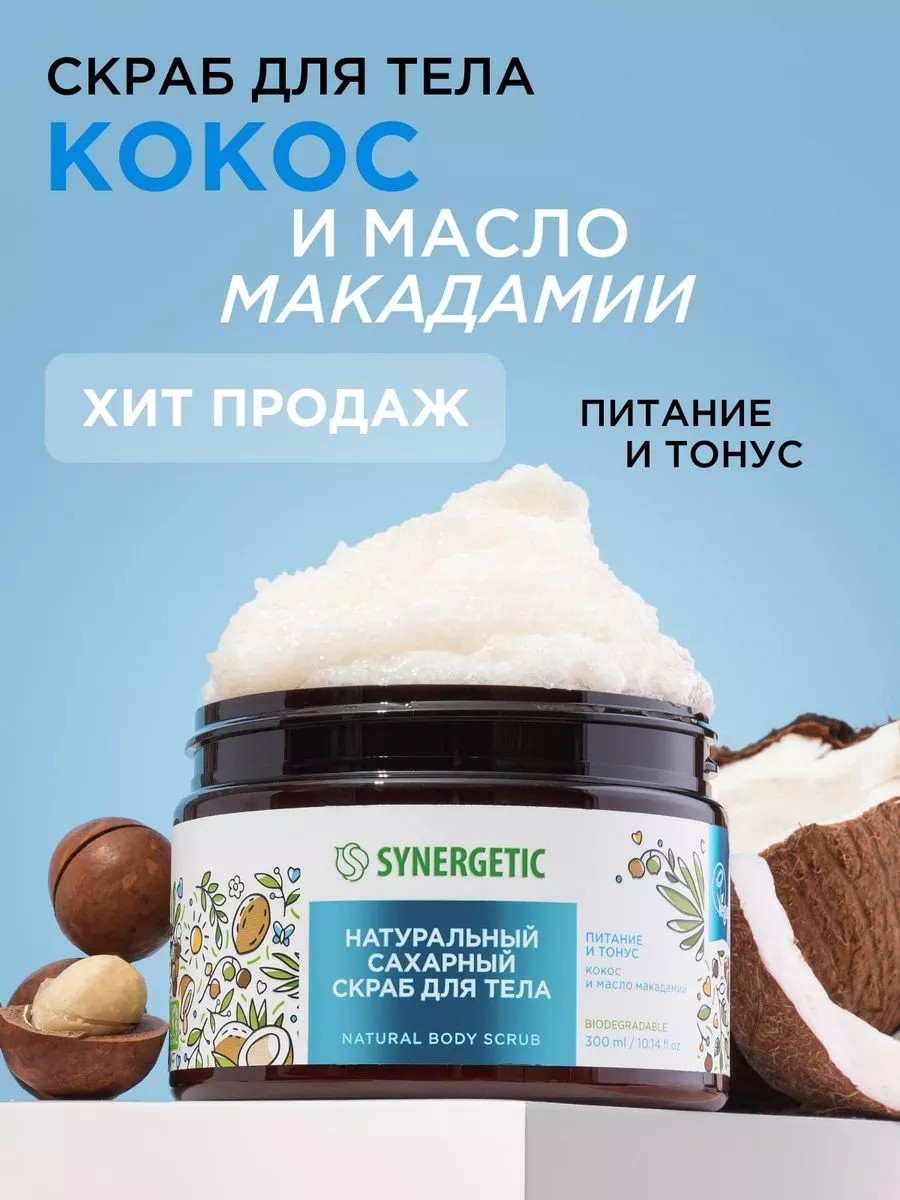 SYNERGETIC Скраб для тела Кокос и макадамия, сахарный, 300 мл
