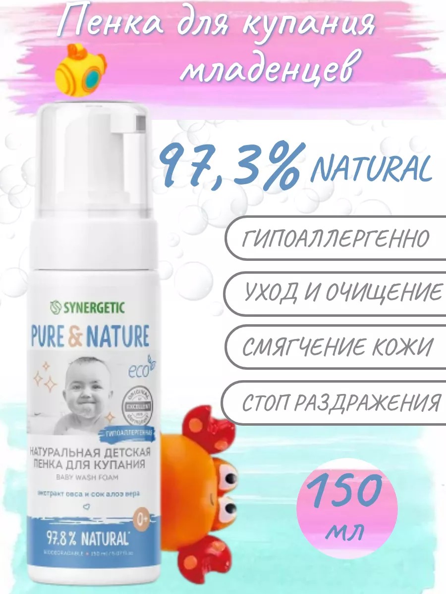 Натуральная гипоаллергенная детская пенка для купания 0+ SYNERGETIC бережно очищает, смягчает и защищает нежную детскую кожу от сухости. Продукт подходит для купания малышей с первых дней жизни.