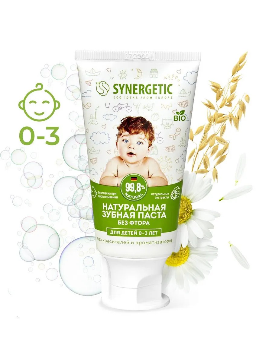 SYNERGETIC – здоровые привычки с самых первых зубов! Наша паста не только эффективно очищает, но и создаёт надёжный барьер против бактерий, обеспечивая комплексную защиту и комфорт вашему малышу.
