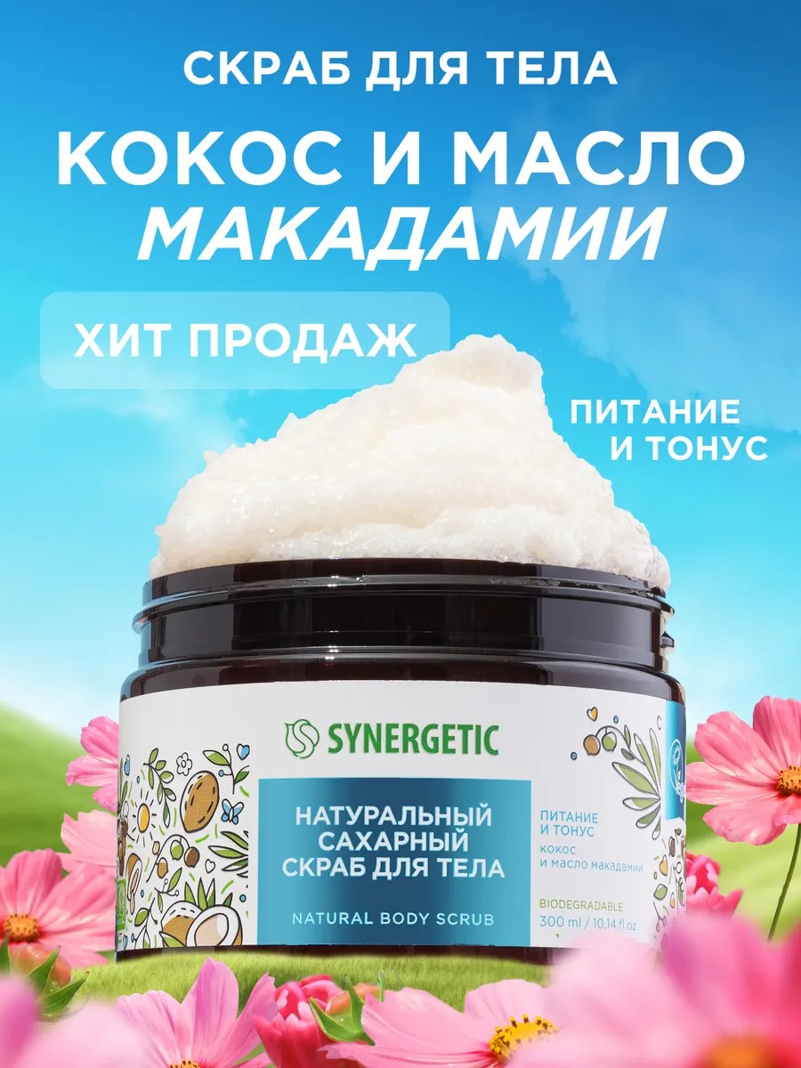 Натуральный сахарный скраб для тела SYNERGETIC "Кокос и масло макадамии" — это эффективное средство для ухода за кожей, более чем на 99% состоящее из натуральных компонентов.