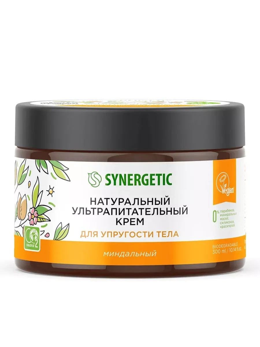 Synergetic, крем для упругости тела натуральный ультрапитательный, 300 мл, 1 штука. Натуральный ультрапитательный крем для упругости тела обеспечивает эффективное увлажнение и дарит коже ощущение комфорта. Активные компоненты крема в сочетании с изомератом сахарида обеспечивают сохранение влаги в коже, обладают регенерирующим действием и восстанавливают барьерные функции кожи. Комплекс натуральных эмолентов в сочетании с маслами миндаля, карите и какао интенсивно питает и восстанавливает кожу, повышая ее эластичность и упругость. Бисаболол успокаивает, способствует снятию раздражения, шелушения, сокращению морщин и повышению эластичности. Натуральный пребиотик трегалоза в сочетании с остальными компонентами помогает нормализовать и сохранить естественный микробиом кожи. Парфюмерная композиция с нотами сладкого миндаля оставляет на коже нежный и приятный аромат на долгое время. Насыщенная ультрапитательная текстура крема оставляет ощущение необыкновенной мягкости и комфорта. Безопасная формула с высокой концентрацией натуральных компонентов не содержит парабенов, минеральных масел, силиконов, красителей и компонентов животного происхождения.
