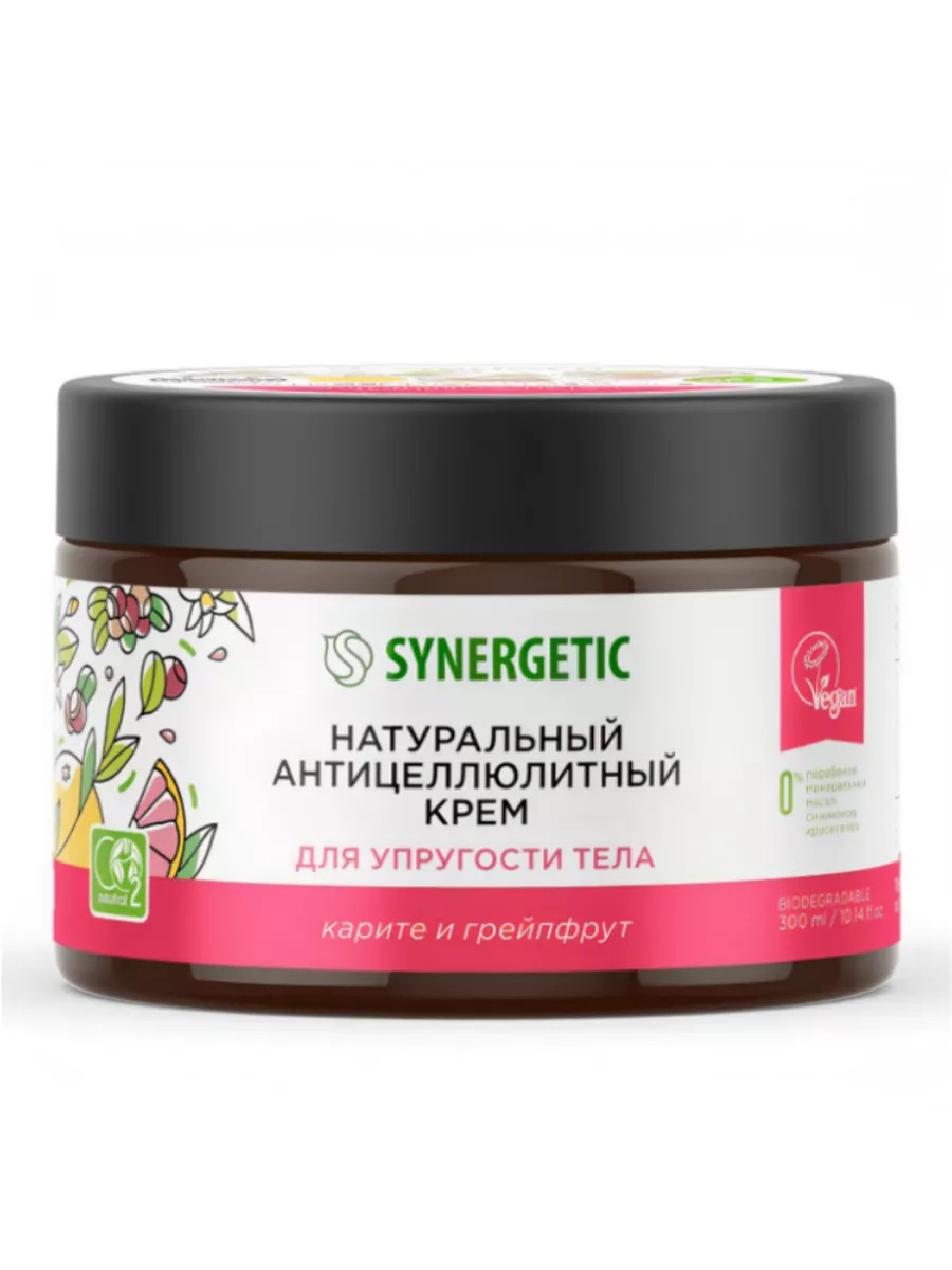 Натуральный антицеллюлитный крем SYNERGETIC для упругости тела питает, увлажняет, тонизирует, подтягивает кожу и дарит долговременное ощущение комфорта и мягкости. Активные компоненты крема в сочетании с изомератом сахарида обеспечивают сохранение влаги в коже, обладают регенерирующим действием и восстанавливают барьерные функции кожи. Масла карите, какао и кокоса способствуют улучшению тонуса и разглаживанию микрорельефа, а экстракты кофе и грейпфрута оказывают мощное антиоксидантное, регенерирующее и омолаживающее действие. Натуральный пребиотик трегалоза в сочетании с остальными компонентами помогает нормализовать и сохранить естественный микробиом кожи. Парфюмерная композиция с нотами грейпфрута и карите оставляет на коже нежный и приятный аромат на долгое время. Безопасная формула с высокой концентрацией натуральных компонентов не содержит парабенов, минеральных масел, силиконов, красителей и компонентов животного происхождения. Крем не тестируется на животных и сертифицирован британской организацией The Vegan Society. Знак Vegan - мировой стандарт этичной продукции. Дерматологически протестирован независимым институтом Dermatest в Германии.