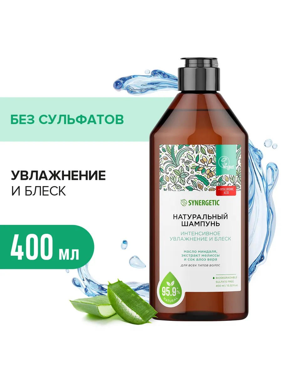 Натуральный бессульфатный шампунь SYNERGETIC "Интенсивное увлажнение и блеск" - эффективное средство для очищения кожи головы и волос. Бессульфатный шампунь обеспечивает деликатное очищение, эффективный уход за волосами и защиту кожу головы. Формула с гиалуроновой кислотой оказывает комплексное воздействие, эффективно увлажняет волосы и придает им здоровое сияние, не утяжеляя их. Комплекс масел миндаля, арганы и конопли питает, смягчает и увлажняет. Инновационные компоненты шампуня укрепляют волосы и стимулируют восстановление кератиновых волокон. Сок алоэ вера и экстракт мелиссы придают волосам эластичность и блеск. Мультифункциональный компонент натурального происхождения софоролипид мягко очищает кожу головы и сохраняет естественный микробиом. Инновационный увлажняющий комплекс усиливает барьерные свойства кожи и обеспечивает до 72 часов глубокого увлажнения. Физиологичный уровень pH 5,5 устраняет сухость кожи головы и гарантирует безопасность при частом использовании средства даже для чувствительной кожи. Натуральный шампунь не содержит SLS, SLES, силиконов, минеральных масел и красителей, а также компонентов животного происхождения, не тестируется на животных и сертифицирован британской организацией The Vegan Society. Знак Vegan - мировой стандарт этичной продукции. Биоразлагаемые компоненты шампуня безопасны для природы и человека и не наносят вред микрофлоре септических установок.